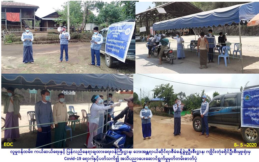 လူမှုဝန်ထမ်း၊ ကယ်ဆယ်ရေးနှင့် ပြန်လည်နေရာချထားရေး ဝန်ကြီးဌာန၊ ဘေးအန္တရာယ်ဆိုင်ရာစီမံခန့်ခွဲမှုဦးစီးဌာန၊ ကျိုင်းတုံခရိုင်ဦးစီးမှူးရုံးမှ တာဝန်ရှိသူများသည် (၈-၅-၂၀၂၀) ရက်နေ့တွင် မြို့နယ်အထွေထွေအုပ်ချုပ်ရေးဦးစီးဌာန၊ မြို့နယ် ပြည်သူ့ ကျန်းမာရေးဦးစီးဌာန၊ မြို့နယ်ကြက်ခြေနီအသင်းတို့နှင့်ပူပေါင်း၍ ကျိုင်းတုံ – တာချီလိတ်၊ နောင်နွန်းစုပေါင်းဂိတ်၌ ကျိုင်းတုံ မြို့တွင်းသို့အဝင်/အထွက် ယာဉ်လိုင်းများတွင်စီးနှင်းလိုက်ပါသော ခရီးသည်များအား ကျန်းမာရေးစစ်ဆေးခြင်း၊ မှတ်တမ်း ကောက်ယူခြင်းနှင့် ကျိုင်းတုံမြို့နယ်၊ လွိုင်မွေကျေးရွာအုပ်စု၊ ရွာသစ်ကျေးရွာ၊ ပူမောက်ကျေးရွာနှင့် မိုင်းလတ်ကျေးရွာအုပ်စု၊ ဝမ်ကျွမ်ကျေးရွာတို့တွင် လတ်တစ်လော နိုင်ငံအသီးသီးတွင် ကူးစက်ပြန့်ပွား လျက်ရှိသော COVID – 19 ကူးစက်ရောဂါ ကြိုတင် ကာကွယ်ထိန်းချုပ်နိုင်ရေး အတွက် COVID-19 ရောဂါ ကူးစက်ပြန့်နှံ့မှု မဖြစ်ပွားစေရန် သိရှိလိုက်နာဆောင်ရွက်ရမည့်အချက်များကို အသိပညာပေးဟောပြောခဲ့ပါကြောင်း သတင်းရရှိပါသည်။