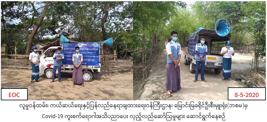 လူမှုဝန်ထမ်း၊ ကယ်ဆယ်ရေးနှင့်ပြန်လည်နေရာချထားရေးဝန်ကြီးဌာန၊ ဘေးအန္တရာယ်ဆိုင်ရာစီမံခန့်ခွဲမှုဦးစီးဌာန၊ မြောင်းမြခရိုင်ဦးစီးမှူးရုံးမှ တာဝန်ရှိသူများသည် (၈-၅-၂၀၂၀)ရက်နေ့၊ နံနက် (၀၇:၃၀)နာရီအချိန်တွင် အိမ်မဲမြို့နယ်၊ ပြန်ကြားရေးနှင့် ပြည်သူ့ဆက်ဆံရေးဦးစီးဌာနတို့နှင့်ပူးပေါင်း၍ မြောင်းမြခရိုင်၊ အိမ်မဲမြို့ နယ်၊ ပွဲစားဂုံညင်းတန်းကျေးရွာ၊ မဲဇလီစာဖြူ စုကျေးရွာ၊ သားကွင်းကျေးရွာ၊ ကျားနဖူးကျေးရွာတို့တွင် လက်တလောနိုင်ငံအသီးသီးတွင် ကူးစက်ပြန့်ပွားလျက်ရှိသော COVID-19 ကူးစက်ရောဂါနှင့်ပတ်သက်ပြီး ဆောင်ရန်/ ရှောင်ရန်တို့အား ကျေးရွာနေပြည်သူတို့အား အသိပညာပေးဟောပြောခြင်းများ ဆောင်ရွက်ခဲ့ကြောင်း သတင်းရရှိပါသည်။