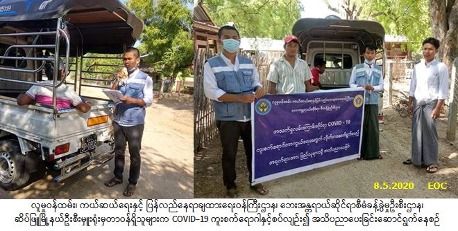 လူမှုဝန်ထမ်း၊ ကယ်ဆယ်ရေးနှင့် ပြန်လည်နေရာချထားရေးဝန်ကြီးဌာန၊ ဘေးအန္တရာယ်ဆိုင်ရာစီမံခန့်ခွဲမှုဦးစီး ဌာန၊ ဆိပ်ဖြူမြို့နယ်ဦးစီးမှူးရုံးမှတာဝန်ရှိသူများသည် (၈-၅-၂၀၂၀) ရက်နေ့၊ (၀၇:၀၀) နာရီအချိန်မှ (၁၂:၀၀) နာရီအချိန်အထိ ကျွန်းတောကျေးရွာအုပ်စုရှိ ကျွန်းတောကျေးရွာနှင့် သပြေကျေးရွာတို့၌ ကျေးရွာအုပ်ချုပ်ရေးမှူးနှင့်ပူးပေါင်း၍ COVID-19 ကူးစက်ရောဂါနှင့်စပ်လျဉ်း၍ ဆောင်ရန်/ရှောင်ရန်အချက်များ ကို အသိပညာပေးနှိုးဆော်ခဲ့ပါကြောင်းသတင်းရရှိပါသည်။