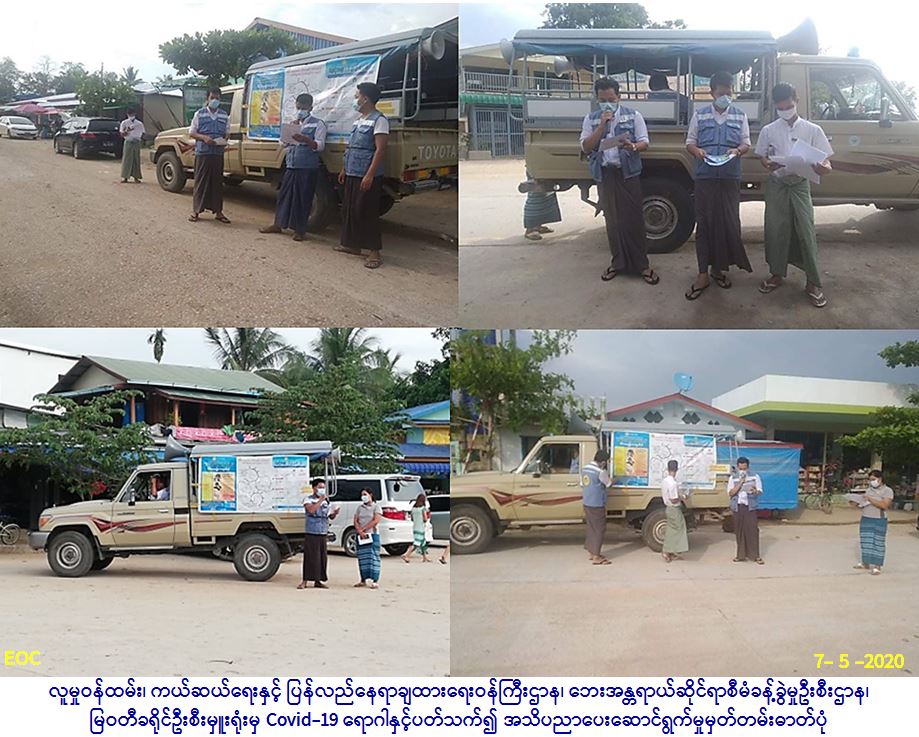 လူမှုဝန်ထမ်း၊ ကယ်ဆယ်ရေးနှင့် ပြန်လည်နေရာချထားရေးဝန်ကြီးဌာန၊ ဘေးအန္တရာယ်ဆိုင်ရာစီမံခန့်ခွဲမှုဦးစီးဌာန၊ မြဝတီခရိုင် ဦးစီးမှူးရုံးမှ တာဝန်ရှိသူများသည် မြဝတီမြို့နယ်၊ ဝေါလေမြိုင်မြို့ အမှတ်(၁၊၂) ရပ်ကွက်၊ အူးဟူးထ၊ လောခေါ်ကျေးရွာ၊ ဆုံဆည်းမြိုင်ကျေးရွာတို့တွင် Covid19 အသက်ရှူလမ်းကြောင်းဆိုင်ရာရောဂါနှင့်ပတ်သက်၍ များပြည်သူများသိရှိလိုက်နာရန် အချက်များအား ကွင်းဆင်း၍ကျန်းမာရေးနှင့်အားကစားဝန်ကြီးဌာနမှ ထုတ်ပြန်ထားသော အသိပေးကြေငြာချက်များ၊ လူမှု ဝန်ထမ်း၊ ကယ်ဆယ်ရေးနှင့်ပြန်လည်နေရာချထားရေးဝန်ကြီးဋ္ဌာနမှ ထုတ်ပြန်ထားသော ဥပဒေများကိုလိုက်နာရန် အသိပေး ကြေငြာချက်များအား အရာထမ်းအမှုထမ်းများမှရပ်ကွက်များအတွင်း ကြော်ငြာခြင်းများ ပြုလုပ်ခဲ့ပါကြောင်း သတင်းရရှိပါသည်။