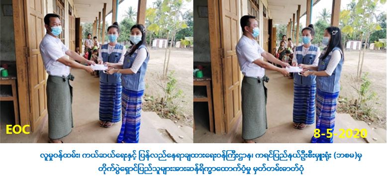 လူမှုဝန်ထမ်း၊ ကယ်ဆယ်ရေးနှင့် ပြန်လည်နေရာချထားရေးဝန်ကြီးဌာန၊ ဘေးအန္တရာယ်ဆိုင်ရာစီမံ ခန့်ခွဲမှုဦးစီးဌာန၊ ကရင်ပြည်နယ်ဦးစီးမှူးရုံးမှ တာဝန်ရှိသူများသည် (၈-၅-၂၀၂၀) ရက်နေ့၊ (၁၄:၀၀) နာရီအချိန်တွင် ဖာပွန်ခရိုင်၊ ကမမောင်းမြို့၊ အမှတ်(၂)ရပ်ကွက်၊ အလကခွဲ(၃) စာသင်ကျောင်းရှိ တိုက်ပွဲရှောင် အိမ်ထောင်စု(၅)စုမှ ကျား(၉)ဦး၊ မ(၁၅)ဦး၊ စုစုပေါင်း(၂၄)ဦးတို့အား ဆန်ရိက္ခာ (၇)ရက်စာဖိုးထောက်ပံ့ငွေ(၅၀,၄၀၀/-) ကျပ်တိတိအား သွားရောက်ထောက်ပံ့ခဲ့ပါကြောင်း သတင်းရရှိပါသည်။