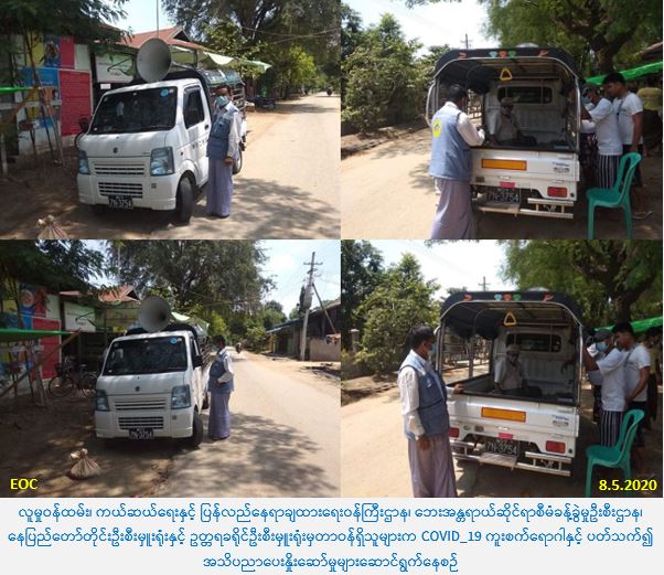 လူမှုဝန်ထမ်း၊ ကယ်ဆယ်ရေးနှင့် ပြန်လည်နေရာချထားရေးဝန်ကြီးဌာန၊ ဘေးအန္တရာယ်ဆိုင်ရာစီမံခန့်ခွဲမှုဦးစီးဌာန၊ ပြည်ထောင်စုနယ်မြေ၊ နေပြည်တော်တိုင်းဦးစီးမှူးရုံးနှင့် ဥတ္တရခရိုင်ဦးစီးမှူးရုံးမှ တာဝန်ရှိသူများသည် (၈-၅-၂၀၂၀) ရက်နေ့ ၊ (၁၂:၀၀) အချိန်မှ (၁၄:၃၀) အချိန်အထိ ပြည်သူများအား COVID-19 ရောဂါကူးစက်ပြန့်နှံ့မှုများ မဖြစ်ပွားစေရန် သိရှိလိုက်နာဆောင်ရွက်ရမည့်အချက်များနှင့် ပတ်သက်၍ အသိပညာပေးခြင်းကို တပ်ကုန်းမြို့နယ်၊ ဘုရင့်နောင်ရပ်ကွက်နှင့် အောင်ဇေယျရပ်ကွက်ရှိ ပြည်သူများသို့ ထိရောက်စွာ လိုက်လံအသိပေးဆောင်ရွက်ခဲ့ပါကြောင်း သတင်းရရှိပါသည်။