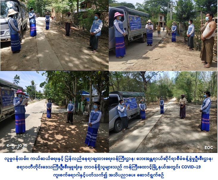 လူမှုဝန်ထမ်း၊ ကယ်ဆယ်ရေးနှင့် ပြန်လည်နေရာချထားရေးဝန်ကြီးဌာန၊ ဘေးအန္တရာယ်ဆိုင်ရာစီမံခန့်ခွဲမှုဦးစီးဌာန၊ ဧရာဝတီတိုင်းဒေသကြီးဦးစီးမှူးရုံးမှ တာဝန်ရှိသူများသည် (၈-၅-၂၀၂၀) ရက်နေ့၊ (ဝ၈:ဝ၀) နာရီအချိန်မှစ၍ ပုသိမ်ခရိုင်၊ ကန်ကြီးထောင့်မြို့နယ်၊ ဒါးကကျေးရွာအုပ်စုရှိ မြဝတီရပ်ကွက်၊ ကမ္ဘောဇရပ်ကွက်၊ ရှုတိုင်းယဉ်ရပ်ကွက်၊ ကိုးဆူရပ်ကွက်၊ စျေးရပ်ကွက်၊ ကိုးနဝင်းရပ်ကွက်၊ မြို့ကွက်ရပ်ကွက်၊ စက်ကုန်းရပ်ကွက်၊ အေးမြချမ်းသာရပ်ကွက်၊ ပိုက်သောင်ကျေးရွာ၊ ကျိန်ချောင်းကျေးရွာ၊ ဖျာတန်းကျေးရွာ၊ ရိုးကြီးကျေးရွာနှင့် လေပွေချောင်ကျေးရွာတို့၌လည်းကောင်း၊ ကွင်းယားအရှေ့ကျေးရွာအုပ်စု၊ ကွင်းယားကြီးကျေးရွာ၌လည်းကောင်း၊ ကညွှတ်ကုန်းကျေးရွာအုပ်စု၊ ကညွှတ်ကုန်းကျေးရွာနှင့် မြောင်ကြီးကျေးရွာတို့၌လည်းကောင်း COVID-19 ကူးစက်ရောဂါနှင့်ပတ်သက်၍ ကျေးရွာနေပြည်သူများအား အသိပညာပေးခြင်းများကို သက်ဆိုင်ရာတာဝန်ရှိသူများနှင့်အတူ ဆောင်ရွက်
