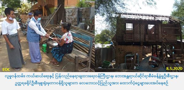 လူမှုဝန်ထမ်း၊ ကယ်ဆယ်ရေးနှင့် ပြန်လည်နေရာချထားရေးဝန်ကြီးဌာန၊ ဘေးအန္တရာယ်ဆိုင်ရာစီမံခန့်ခွဲမှုဦးစီးဌာန၊ ဥတ္တရခရိုင်ဦးစီးမှူးရုံးမှတာဝန်ရှိသူများသည် ပြည်ထောင်စုနယ်မြေ၊ နေပြည်တော်၊ ဥတ္တရခရိုင်၊ တပ်ကုန်းမြို့နယ်၊ ဘုရင့်နောင်ရပ်ကွက်၊ နယ်မြေ(၄)၊ ဗိုလ်စောနောင်လမ်း၌ (၆-၅-၂၀၂၀)ရက်နေ့၊ (၁၆:၀၀)အချိန်မှ (၁၆:၁၅) အချိန်အထိ ဖြစ်ပွားခဲ့သော လေပြင်းတိုက်ခတ်မှုကြောင့် ပျက်စီးဆုံးရှုံးခဲ့သည့် အမိုးလန်နေအိမ် (၁)လုံးအတွက် အိမ်ဆောက်ပစ္စည်းဖိုး ထောက်ပံ့ငွေ(၃၀,၀၀ဝ/-)ကျပ်၊ ဘေးသင့်လူဦးရေ (၁၄)ဦးအတွက် ဆန်ရိက္ခာဖိုးထောက်ပံ့ငွေ(၂၉,၄၀ဝ/-)ကျပ်၊ စုစုပေါင်းထောက်ပံ့ငွေ (၅၉,၄၀ဝ/-)ကျပ်အား (၈-၅-၂၀၂၀)ရက်နေ့ (၁၄:၀၀)အချိန်တွင် ဘေးသင့်ပြည်သူများလက်ဝယ်သို့ သွားရောက်ထောက်ပံ့ခဲ့ပါကြောင်း သတင်းရရှိပါသည်။