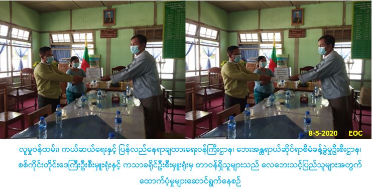 လူမှုဝန်ထမ်း၊ ကယ်ဆယ်ရေးနှင့် ပြန်လည်နေရာချထားရေးဝန်ကြီးဌာန၊ ဘေးအန္တရာယ်ဆိုင်ရာစီမံခန့်ခွဲမှုဦးစီးဌာန၊ စစ်ကိုင်းတိုင်းဒေကြီးဦးစီးမှူးရုံးနှင့် ကသာခရိုင်ဦးစီးမှူးရုံးမှ တာဝန်ရှိသူများသည် (၆-၅-၂၀၂၀)ရက်နေ့တွင် လေပြင်းတိုက်ခတ်မှုကြောင့် စစ်ကိုင်းတိုင်းဒေသကြီး၊ ကသာခရိုင်၊ အင်းတော်မြို့နယ်မှ အမိုးလန်ဘုန်းတော်ကြီးကျောင်း(၁)ကျောင်း၊ အမိုးလန်နေအိမ်ခြေ(၅၂)လုံး၊ အိမ်ထောင်စု (၅၂)စုမှ လူဦးရေ(၂၈၄)ဦးအတွက် အိမ်ဆောက်ပစ္စည်းဖိုးထောက်ပံ့ငွေ (၂၃၅၀၀၀၀/-)ကျပ်၊ ဆန်ရိက္ခာဖိုးထောက်ပံ့ငွေ(၅၉၆၄၀၀/-)ကျပ်၊စုစုပေါင်းထောက်ပံ့ငွေ(၂၉၄၆၄၀ဝ/-)ကျပ်အား (၈-၅-၂၀၂၀)ရက်နေ့ (၁၃း၄၅)အချိန်တွင် ထောက်ပံ့ပေးအပ်ခဲ့ပါကြောင်း သတင်းရရှိပါသည်။