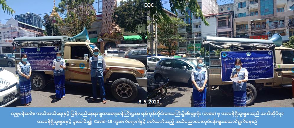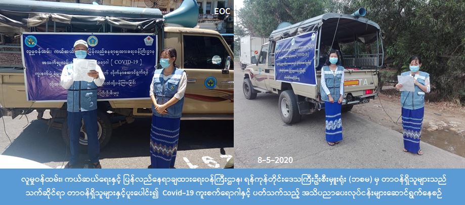 (၈ -၅-၂၀၂၀)ရက်နေ့တွင် လူမှုဝန်ထမ်း၊ ကယ်ဆယ်ရေးနှင့် ပြန်လည်နေရာချထားရေးဝန်ကြီးဌာန၊ ဘေးအန္တရာယ်ဆိုင်ရာ စီမံခန့်ခွဲမှုဦးစီးဌာန၊ ရန်ကုန်တိုင်းဒေသကြီးဦးစီးမှူးရုံးမှ အရာထမ်း၊ အမှုထမ်း များသည် ရန်ကုန်အနောက်ပိုင်းခရိုင်၊ လသာမြို့နယ်၊ အမှတ်(၁/၂/၃/၄/၅/၆/၇)ရပ်ကွက်များတွင် (Covid-19) အသက်ရှူလမ်းကြောင်းဆိုင်ရာရောဂါနှင့်ပတ်သက်၍ အများပြည်သူများသိရှိ လိုက်နာ နိုင်ရန် ကျန်းမာရေးနှင့် အားကစားဝန်ကြီးဌာနမှ ထုတ်ပြန်ထားသော အသိပေးကြေငြာချက်များအား ရပ်ကွက်များအတွင်း အသိပညာပေး ကြော်ငြာခြင်းများ ပြုလုပ်ခဲ့ကြောင်း သိရှိရပါသည်။