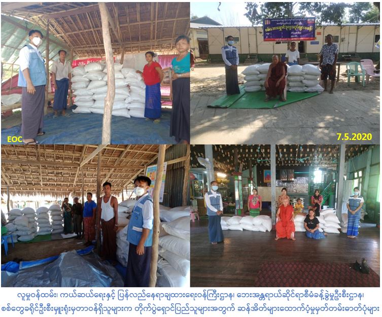 လူမှုဝန်ထမ်း၊ ကယ်ဆယ်ရေးနှင့် ပြန်လည်နေရာချထားရေးဝန်ကြီးဌာန၊ ဘေးအန္တရာယ်ဆိုင်ရာစီမံခန့်ခွဲမှုဦးစီးဌာန၊ စစ်တွေခရိုင်ဦးစီးမှူးရုံးမှတာဝန်ရှိသူများသည် ရခိုင်ပြည်နယ်အတွင်း တိုက်ပွဲများဖြစ်ပွားမှုကြောင့် နေရပ်စွန့်ခွာ၍ ရောက်ရှိခိုလှုံလျက်ရှိသည့် စစ်တွေခရိုင် ပုဏ္ဏားကျွန်းမြို့ရှိ တိုက်ပွဲရှောင်စုရပ်(၈)ခုမှ အိမ်ထောင်စု(၄၉၄)စု၊ လူဦးရေ(၂၂၄၄)ဦးအတွက် ဆန်ရိက္ခာ(၁)လစာ ဆန်(၇၀၁)အိတ်၊ (၆)ပြည်အား (၇-၅-၂၀၂၀) ရက်နေ့တွင်လည်းကောင်း၊ စစ်တွေမြို့ရှိ တိုက်ပွဲရှောင်စုရပ်(၂)ခုမှ အိမ်ထောင်စု(၂၄)စု၊ လူဦးရေ(၉၅)ဦးအတွက် ဆန်ရိက္ခာ(၂)ပတ်စာ ဆန်(၁၃)အိတ်၊ (၂၀)ပြည်၊ (၄)ဗူးနှင့် တိုက်ပွဲရှောင်စုရပ်(၉)ခုမှ အိမ်ထောင်စု (၂၂၄)စု၊ လူဦးရေ(၉၂၆)ဦးအတွက် ဆန်ရိက္ခာ(၁)လစာ ဆန်(၂၈၉)အိတ်၊ (၉)ပြည်အားလည်းကောင်း (၈-၅-၂၀၂၀) ရက်နေ့တွင် စစ်တွေခရိုင်ဦးစီးမှူးရုံးမှ သွားရောက်ထောက်ပံ့ပေးအပ်ခဲ့ပါကြောင်း သတင်းရရှိပါသည်။