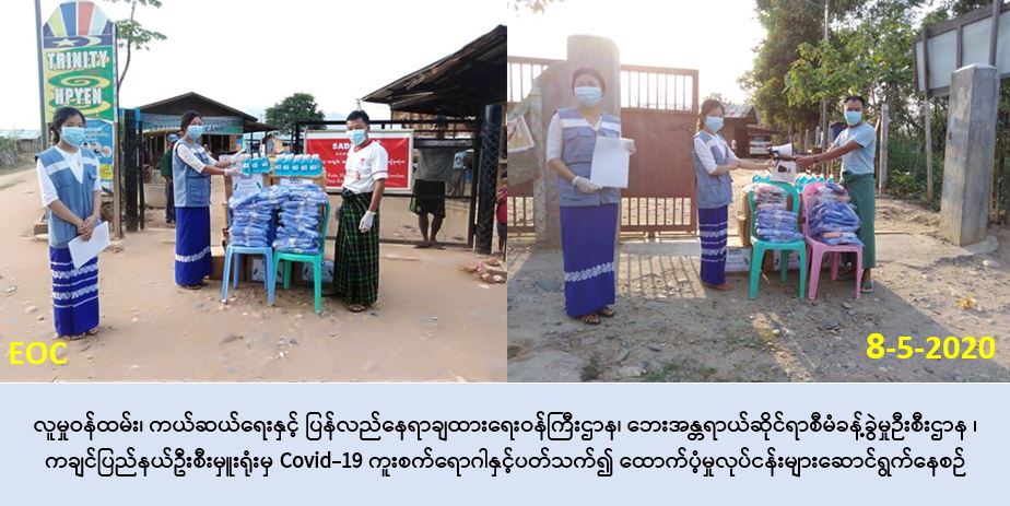လူမှုဝန်ထမ်း၊ ကယ်ဆယ်ရေးနှင့် ပြန်လည်နေရာချထားရေးဝန်ကြီးဌာန၊ ဘေးအန္တရာယ်ဆိုင်ရာ စီမံခန့်ခွဲမှုဦးစီးဌာန၊ ကချင်ပြည်နယ်ဦးစီးမှူးရုံးမှ တာဝန်ရှိသူများသည် (၈-၅-၂၀၂၀) ရက်နေ့ တွင် Covid-19 နှင့် ပတ်သက်၍ မြစ်ကြီးနားမြို့နယ်ရှိ၊ နောင်နန်းတြီနတီ၊ နောင်နန်းဂျော်မဆပ် IDPs စခန်းများသို့ လက်သန့်ဆေးရေ (၆၄၀) ဘူး၊ Hand Speaker(၂)ခု၊ Memory Stick(၂)ခု၊ အဝတ် Mask(၂,၉၄၀) ခု တို့ အားသွားရောက်ပေးအပ်ခဲ့ကြောင်း သတင်းရရှိပါသည်။