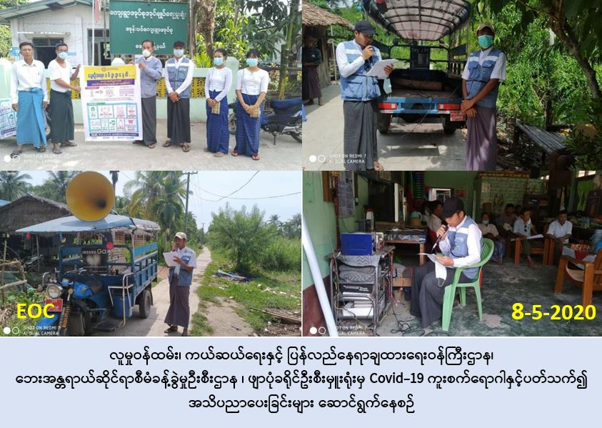 လူမှုဝန်ထမ်း၊ ကယ်ဆယ်ရေးနှင့် ပြန်လည်နေရာချထားရေးဝန်ကြီးဌာန၊ ဘေးအန္တရာယ်ဆိုင်ရာ စီမံခန့်ခွဲမှုဦးစီးဌာန၊ ဖျာပုံခရိုင်ဦးစီးမှူးရုံးမှ တာဝန်ရှိသူများသည် (၈-၅-၂၀၂၀) ရက်နေ့တွင် ဒေးဒရဲမြို့နယ်၊ အုန်းပင်ကျေးရွာအုပ်စုမှ ဆားအိုးချောင်းကျေးရွာ၊ ဗန်ကျွန်းကျေးရွာ၊ မြင်းကကုန်း ကျေးရွာမှ တာဝန်ရှိသူတို့နှင့်အတူ COVID-19 ရောဂါကူးစက်ပျံ့နှံ့မှုများ မဖြစ်ပွားစေရေးအတွက် လိုက်နာဆောင်ရွက်ရန်များကို ကျေးရွာရှိပြည်သူများအား အသိပညာပေးခြင်းလုပ်ငန်းများနှင့် အသိပညာပေး ဗီနိူင်းပိုစတာများ ပေးအပ်ဆောင်ရွက်ခဲ့ကြောင်း သတင်းရရှိပါသည်။