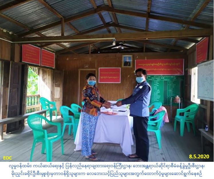 လူမှုဝန်ထမ်း၊ ကယ်ဆယ်ရေးနှင့် ပြန်လည်နေရာချထားရေးဝန်ကြီးဌာန၊ ဘေးအန္တရာယ်ဆိုင်ရာစီမံခန့်ခွဲမှုဦးစီးဌာန၊ မိုးညှင်းခရိုင်ဦးစီးမှူးရုံးမှတာဝန်ရှိသူများသည် (၆-၅-၂၀၂၀)ရက်နေ့ (၁၃:၀၀) အချိန်ခန့်၌ မိုးညှင်းမြို့နယ်အတွင်း မိုးသက်လေပြင်းတိုက်ခတ်မှုကြောင့် အမိုးလန်ပျက်စီးနေအိမ်(၁)လုံး၊ အိမ်ထောင်စု(၁)စုမှ လူဦးရေ(၅)ဦးအတွက် ဆန်ရိက္ခာဖိုး (၇)ရက်စာထောက်ပံ့ငွေ(၁၀,၅၀ဝ/-)ကျပ်နှင့် အိမ်ဆောက်ပစ္စည်း ဖိုးထောက်ပံ့ငွေ (၂၈,၀၀ဝ/-) ကျပ်၊ စုစုပေါင်းထောက်ပံ့ငွေ(၃၈,၅၀ဝ/-)ကျပ်အား (၈-၅-၂၀၂၀)ရက်နေ့ (၁၄:၃၀) အချိန်တွင် ကွင်းဆင်းထောက်ပံ့ပေးအပ်ခဲ့ပါကြောင်း သတင်းရရှိပါသည်။