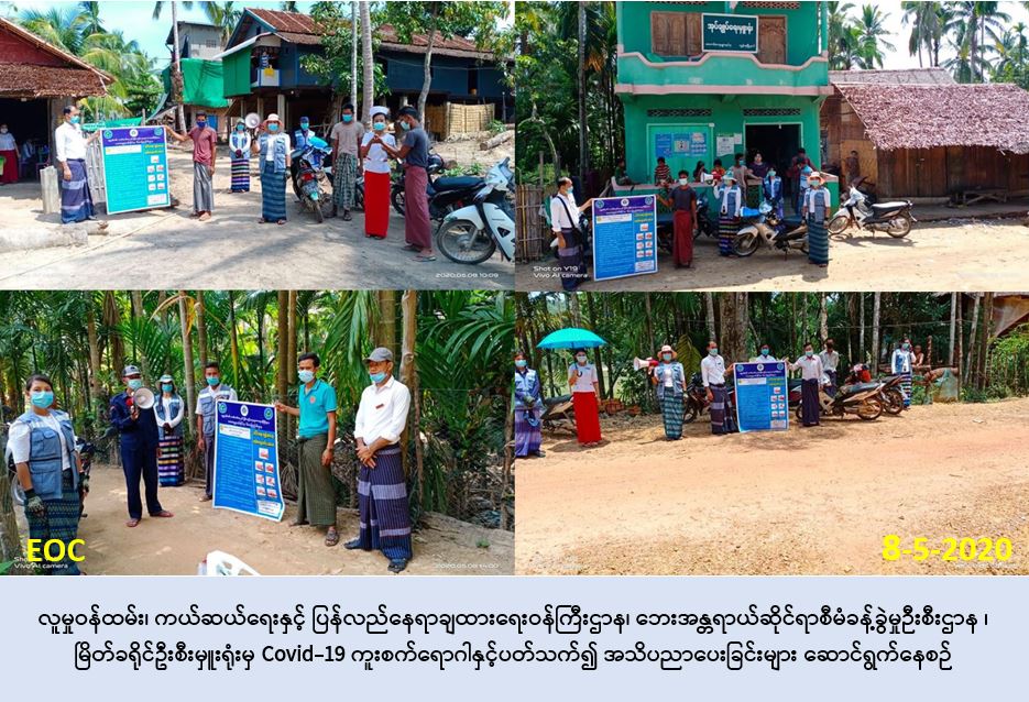 လူမှုဝန်ထမ်း၊ ကယ်ဆယ်ရေးနှင့် ပြန်လည်နေရာချထားရေးဝန်ကြီးဌာန၊ ဘေးအန္တရာယ်ဆိုင်ရာ စီမံခန့်ခွဲမှုဦးစီးဌာန၊ မြိတ်ခရိုင်ဦးစီးမှူးရုံးမှ တာဝန်ရှိသူများသည် (၈-၅-၂၀၂၀) ရက်နေ့တွင် ရပ်ကျေးအဖွဲ့၊ အရန်မီးသတ်တပ်ဖွဲ့တို့နှင့် ပူးပေါင်း၍ ကျွန်းစုမြို့နယ်၊ ဇေးကမိကျေးရွာ၊ ပန်း တောင်ကျေးရွာ၊ တောင်ပုကျေးရွာ၊ ညောက်ဘီးကျေးရွာ၊ အညှင်းကျေးရွာ၊ ပဲယာကျေးရွာတို့တွင် COVID 19 ရောဂါ ကူးစက်ပြန့်ပွားမှုမရှိစေရေး အသိပညာပေး ဆော်သြခြင်း၊ ဗီနိုင်းပိုစတာကပ် ခြင်းတို့ကို ဆောင်ရွက်ခဲ့ကြောင်း သတင်းရရှိပါသည်။