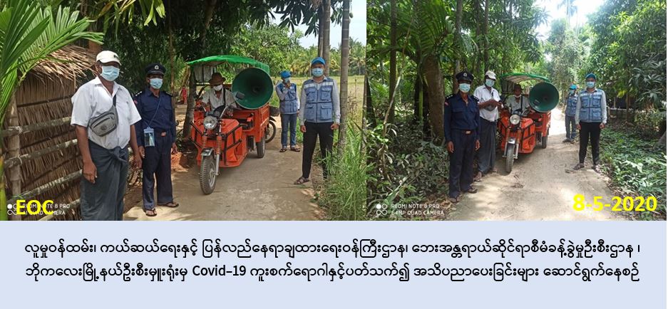 လူမှုဝန်ထမ်း၊ ကယ်ဆယ်ရေးနှင့် ပြန်လည်နေရာချထားရေးဝန်ကြီးဌာန၊ ဘေးအန္တရာယ်ဆိုင်ရာ စီမံခန့်ခွဲမှုဦးစီးဌာန၊ ဘိုကလေးမြို့နယ်ဦးစီးမှူးရုံးမှ တာဝန်ရှိသူများသည် (၈-၅-၂၀၂၀) ရက်နေ့ တွင် ဘိုကလေးမြို့နယ် ပျဉ်းမကုန်းကျေးရွာအုပ်စု၊ ပျဉ်းမကုန်းကျေးရွာတွင် (၁၀:၀၀)နာရီ၌ လည်းကောင်း ၊ကဇန်ဒေါင့်ကျေးရွာတွင်(၁၂:၀၀)နာရီ၌လည်းကောင်း၊ ကြံခင်းဝက်စုကျေးရွာတွင် (၁၄:၀၀)နာရီ၌လည်းကောင်း၊ Covid- 19 ကူးစက်ရောဂါနှင့်ပတ်သက်ပြီး ဆောင်ရန်/ ရှောင်ရန် များနှိုးဆော်ခြင်းအား ကျေးရွာရှိအုပ်ချုပ်ရေးမှူး၊ ရပ်မိရပ်ဖများနှင့်အတူ ကျေးရွာနေပြည်သူတို့ အား အသိပညာပေးခြင်းများ ဆောင်ရွက်ခဲ့ကြောင်း သတင်းရရှိပါသည်။