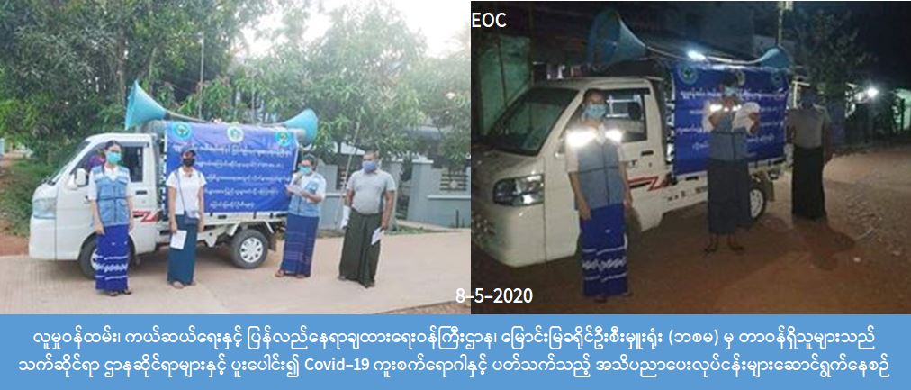 လူမှုဝန်ထမ်း၊ကယ်ဆယ်ရေးနှင့်ပြန်လည်နေရာချထားရေးဝန်ကြီးဌာန၊ ဘေးအန္တရာယ်ဆိုင်ရာစီမံခန့်ခွဲမှု ဦးစီးဌာန၊ မြောင်းမြခရိုင်ဦးစီးမှူးရုံးမှ တာဝန်ရှိသူများသည် (၈-၅-၂၀၂၀)ရက်နေ့၊ ညနေ (၁၈:၀၀) နာရီ အချိန်တွင် ခရိုင်ပြန်ကြားရေးနှင့်ပြည်သူ့ဆက်ဆံရေးဦးစီးဌာနတို့နှင့် ပူးပေါင်း၍ မြောင်းမြခရိုင်၊ မြောင်းမြ မြို့နယ်၊ ရွှေဂုံတိုင်ရပ်ကွက်၊ တာဝတိံသာရပ်ကွက်၊ကိုပိတ်ကုန်းရပ်ကွက် ရွှေလားကုန်းရပ်ကွက်၊ ဇောင်းဝါးပင်ဆိပ်ရပ်ကွက်၊ အရှေ့စံပြရပ်ကွက်၊ အနောက်စံပြရပ်ကွက်၊ စမ်းချောင်းရပ်ကွက်၊ မဟာစည် ရပ်ကွက် တို့တွင် လက်တလော နိုင်ငံအသီးသီးတွင် ကူးစက်ပြန့်ပွားလျက်ရှိသော COVID-19 ကူးစက် ရောဂါနှင့်ပတ်သက်ပြီး ဆောင်ရန်၊ ရှောင်ရန်တို့အား ကျေးရွာနေပြည်သူတို့အား အသိပညာပေး ဟောပြောခြင်းများ ဆောင်ရွက်ခဲ့ကြောင်း သိရှိရပါသည်။