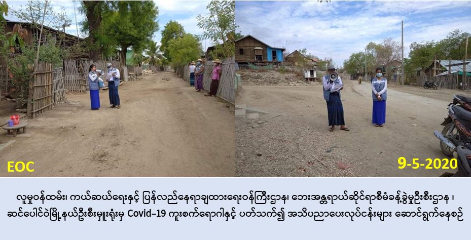 လူမှုဝန်ထမ်း၊ ကယ်ဆယ်ရေးနှင့် ပြန်လည်နေရာချထားရေးဝန်ကြီးဌာန၊ ဘေးအန္တရာယ်ဆိုင်ရာ စီမံခန့်ခွဲမှုဦးစီးဌာန၊ ဆင်ပေါင်ဝဲမြို့နယ်ဦးစီးမှူးရုံးမှ တာဝန်ရှိသူများသည် (၉-၅-၂၀၂၀) ရက်နေ့၊ နံနက်(၀၈:၀၀) နာရီအချိန်တွင် ပြန်ကြားရေးနှင့်ပြည်သူ့ဆက်ဆံရေးဦးစီးဌာနတို့နှင့်ပူးပေါင်း၍ ဆင်ပေါင်ဝဲမြို့နယ်၊ ကန်ချောင်းကျေးရွာအုပ်စု၊ ကန်ချောင်းကျေးရွာ၊ ပေလည်ကျေးရွာ၊ ဌက်ပျော ကျင်းကျေးရွာများသို့ သွားရောက်ပြီး COVID – 19 ရောဂါကူးစက်ပျံ့နှံ့မှုများနှင့် ပတ်သက်၍ အသိပညာပေးဟောပြောမှုများ ဆောင်ရွက်ခဲ့ကြောင်း သတင်းရရှိပါသည်။