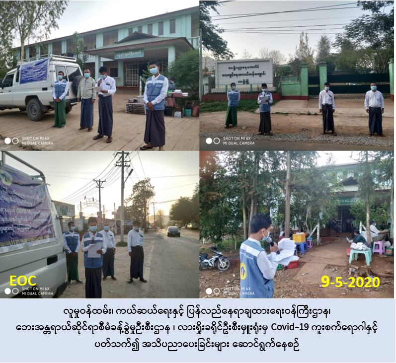 လူမှုဝန်ထမ်း၊ ကယ်ဆယ်ရေးနှင့် ပြန်လည်နေရာချထားရေးဝန်ကြီးဌာန၊ ဘေးအန္တရာယ်ဆိုင်ရာ စီမံခန့်ခွဲမှုဦးစီးဌာန၊ လားရှိုးခရိုင်ဦးစီးမှူးရုံးမှ တာဝန်ရှိသူများသည် ပြန်လည်ထူထောင်ရေး ဦးစီးဌာန၊ မူးယစ်ဆေးဖြတ်ပြီးသူများ ပြန်လည်ထူထောင်ရေးစခန်း၊ လူမှုဝန်ထမ်းဦးစီးဌာန၊ မြို့နယ်အထွေထွေအုပ်ချုပ်ရေးဦးစီးဌာနတို့နှင့် ပူးပေါင်း၍ (၉-၅-၂၀၂၀) ရက်နေ့တွင် လားရှိုးမြို့ နယ် မောက်တောင်းကျေးရွာ၊ မိုင်းကျိုင်းကျေးရွာ၊ စယ်ပေါင်ကျေးရွာနှင့် လားရှိုးပညာရေးကောလိပ်၌ တစ်ညအိပ်တည်းခိုနေထိုင်ရသော နေရပ်ပြန်ပြည်သူများအား COVID-19 ရောဂါ ကူးစက်ပျံ့နှံ့မှု မဖြစ်ပွားစေရန် သိရှိလိုက်နာ ဆောင်ရွက်ရမည့်အချက်များကို အသိပေး ပန်ကြားခြင်းများကို ဆောင်ရွက်ခဲ့ကြောင်း သတင်းရရှိပါသည်။