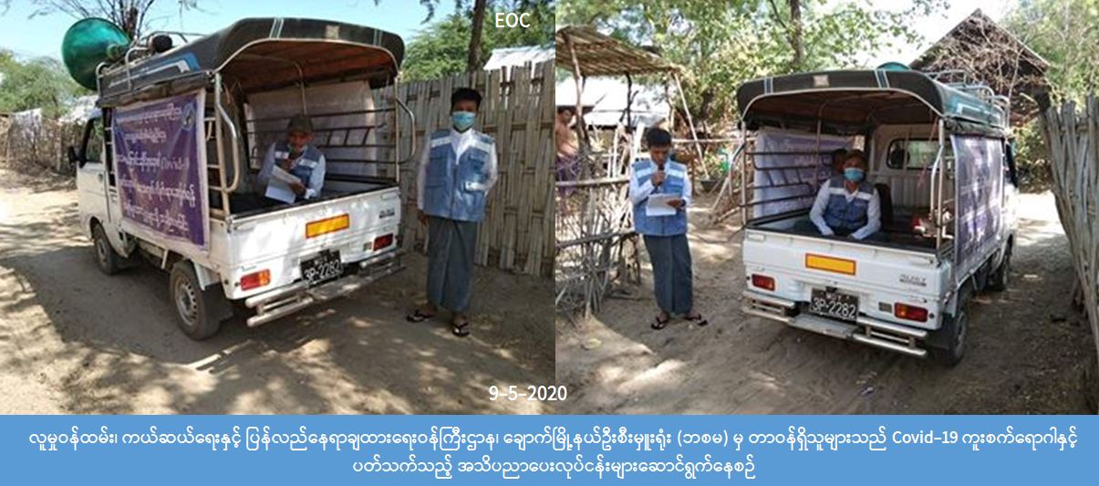 လူမှုဝန်ထမ်း၊ ကယ်ဆယ်ရေးနှင့် ပြန်လည်နေရာချထားရေးဝန်ကြီးဌာန၊ ဘေးအန္တရာယ်ဆိုင်ရာစီမံခန့်ခွဲမှုဦးစီး ဌာန၊ မကွေးတိုင်းဒေသကြီး၊ ချောက်မြို့နယ်ဦးစီးမှူးရုံးမှ တာဝန်ရှိသူများသည် (၉-၅-၂၀၂၀) ရက်နေ့(၇:၃၀) နာရီမှ (၁၂:၀၀) နာရီအချိန်ထိ မကွေးခရိုင်၊ ချောက်မြို့နယ်အတွင်းရှိ သစ်ချိုကုန်းအရှေ့ကျေးရွာ၊ သစ်ချိုကုန်း အနောက်ကျေးရွာ၊ ကြပ်စုကျေးရွာများသို့ COVID-19 ရောဂါနှင့် ပတ်သက်၍ ကာကွယ်၊ တားဆီး၊ ထိန်းချုပ်၊ ကုသရေးဆိုင်ရာပြည်သူလူထု အသိပညာပေးပန်ကြားချက်များကို လှည့်လည်ဟောပြောခြင်း လုပ်ငန်းများကို ဆောင်ရွက်ခဲ့ပါကြောင်း သိရှိရပါသည်။