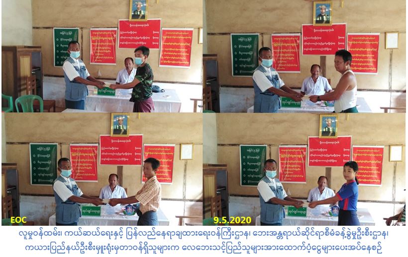 လူမှုဝန်ထမ်း၊ ကယ်ဆယ်ရေးနှင့် ပြန်လည်နေရာချထားရေးဝန်ကြီးဌာန၊ ဘေးအန္တရာယ်ဆိုင်ရာစီမံခန့်ခွဲမှုဦးစီးဌာန၊ ကယားပြည်နယ်ဦးစီးမှူးရုံးမှတာဝန်ရှိသူများသည် (၈-၅-၂၀၂၀) ရက်နေ့တွင် ကယားပြည်နယ်၊ လွိုင်ကော်ခရိုင်၊ လွိုင်ကော်မြို့နယ်၊ လောပိတကျေးရွာအုပ်စု၊ လေးအိမ်စုကျေးရွာ၊ ဓမ္မစင်္ကြာကျေးရွာ၊ လောကထု(ကွက်သစ်)နှင့် လောကထုကျေးရွာတို့တွင် လေပြင်းတိုက်ခတ်မှုကြောင့် ဘုန်းကြီးကျောင်း(၁)ကျောင်းနှင့် နေအိမ်(၁၀)လုံး အမိုးလန်ပျက်စီးခဲ့ရာ ဘေးသင့်အိမ်ထောင်စု(၁၀)စု၊ လူဦးရေ(၄၂)ဦးအတွက် အိမ်ဆောက်ပစ္စည်း ဖိုးထောက်ပံ့ငွေ(၅၉၅,၀၀၀/-)ကျပ်၊ ကျောင်းဆောက်ပစ္စည်းဖိုးထောက်ပံ့ငွေ(၉၀,၀၀၀/-)ကျပ်နှင့် ဆန်ရိက္ခာဖိုး(၇)ရက်စာထောက်ပံ့ငွေ(၈၈,၂၀၀/-)ကျပ်၊ စုစုပေါင်းထောက်ပံ့ငွေ(၇၇၃,၂၀၀/-) ကျပ်အား (၉-၅-၂၀၂၀) ရက်နေ့(၁၃:၃၀)နာရီအချိန်တွင် ပေးအပ်ထောက်ပံ့ခဲ့ပါကြောင်း သတင်းရရှိပါသည်။