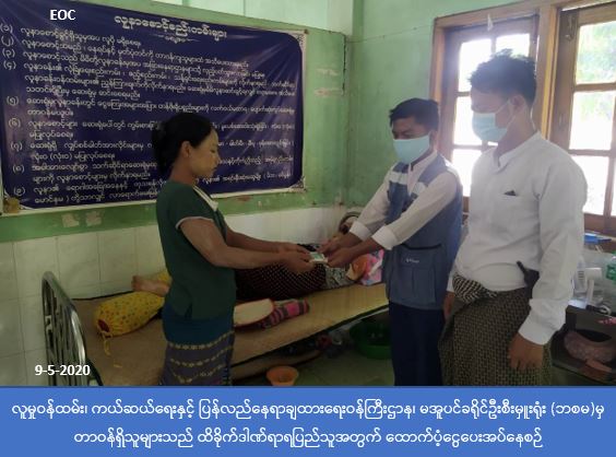 လူမှုဝန်ထမ်း၊ ကယ်ဆယ်ရေးနှင့်ပြန်လည်နေရာချထားရေးဝန်ကြီးဌာန၊ ဘေးန္တရာယ်ဆိုင်ရာစီမံခန့်ခွဲမှု ဦးစီးဌာန၊ မအူပင်ခရိုင်ဦးစီးမှူးရုံးမှ တာဝန်ရှိသူများသည် မအူပင်ခရိုင်၊ ပန်းတနော်မြို့နယ်၊ ကွက်သစ် ရပ်ကွက်၌ (၂၉-၄-၂၀၂၀)ရက်နေ့တွင် ဖြစ်ပွားခဲ့သော ဓါတ်ငွေ့ပိုက်လိုင်းမှဓါတ်ငွေ့ယိုစိမ့်မှုကြောင့် ထိခိုက်ဒါဏ်ရာရရှိခဲ့သူ (၁) ဦးအတွက် ကယ်ဆယ်ရေးရန်ပုံငွေ (၅၀,၀၀ဝ/-) ကျပ်ကို (၉-၅-၂၀၂၀) ရက်နေ့၊ (၁၁:၀၀)အချိန်တွင် အထွေထွေအုပ်ချုပ်ရေးဦးစီးဌာနမှ တာဝန်ရှိသူများနှင့်အတူ ထိခိုက် ဒါဏ်ရာရပြည်သူအတွက် ထောက်ပံ့ပေးအပ်ခဲ့ကြောင်း သိရှိရပါသည်။