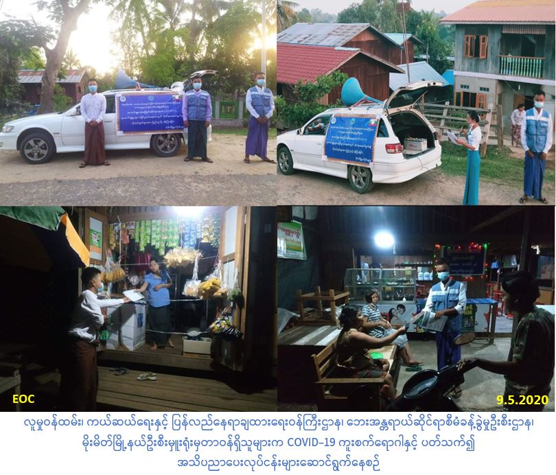လူမှုဝန်ထမ်း၊ ကယ်ဆယ်ရေးနှင့် ပြန်လည်နေရာချထားရေးဝန်ကြီးဌာန၊ ဘေးအန္တရာယ်ဆိုင်ရာစီမံခန့်ခွဲမှုဦးစီးဌာန၊ မိုးမိတ်မြို့နယ်ဦးစီးမှူးရုံးမှတာဝန်ရှိသူများသည် မဘိမ်းမြို့နယ်၊ လူမှုဝန်ထမ်းဦးစီးဌာနတို့နှင့် ပူးပေါင်း၍ (၉-၅-၂၀၂၀) ရက်နေ့တွင် မဘိမ်းမြို့ပေါ်ရပ်ကွက်များဖြစ်သည့် မြို့မရပ်ကွက်၊ တိုက်ကုန်းရပ်ကွက်၊ ကုန်းခါးရပ်ကွက်နှင့် နမ့်ပုံးပုံးရပ်ကွက်တို့တွင် အသက်ရှူလမ်းကြောင်းဆိုင်ရာရောဂါ (COVID-19) ကူးစက်ပျံ့နှံ့မှုများ မဖြစ်စေရေးအတွက် လိုက်နာဆောင်ရွက်ရန်လိုအပ်ချက်များအား ပြည်သူသို့ပန်ကြားခြင်းအစီအစဉ်ကို ဆောင်ရွက်ခြင်းနှင့် ဈေးဆိုင်များလိုက်နာရန် အသိပညာပေးလက်ကမ်းစာစောင်များ မျှဝေခြင်းတို့ကို ဆောင်ရွက်ခဲ့ပါကြောင်း သတင်းရရှိပါသည်။