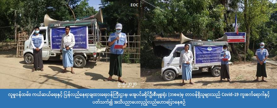 လူမှုဝန်ထမ်း၊ ကယ်ဆယ်ရေးနှင့် ပြန်လည်နေရာချထားရေးဝန်ကြီးဌာန၊ ဘေးအန္တရာယ်ဆိုင်ရာ စီမံ ခန့်ခွဲမှုဦးစီးဌာန၊ မအူပင်ခရိုင်ဦးစီးမှူးရုံးမှ တာဝန်ရှိသူများသည် (၉-၅-၂၀၂၀) ရက်နေ့တွင် မအူပင် မြို့နယ်၊ ဘီးလင်းကျေးရွာအုပ်စုအတွင်းရှိ ကျေးရွာခွဲ(၃)ရွာ၌ Covid-19 ရောဂါ ကူးစက်ပျံ့ပွားမှုများ မဖြစ်ပွားစေရန်တွက် အများပြည်သူသိရှိလိုက်နာဆောင်ရွက်ရန်အချက်များအား လော်စပီကာ၊ ဟန်းစပီကာများဖြင့် လှည့်လည်ဟောပြောခဲ့ကြောင်း သိရှိရပါသည်။