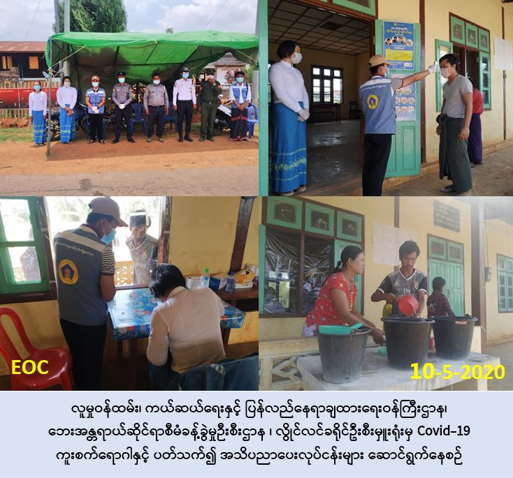 လူမှုဝန်ထမ်း၊ ကယ်ဆယ်ရေးနှင့် ပြန်လည်နေရာချထားရေးဝန်ကြီးဌာန၊ ဘေးအန္တရာယ်ဆိုင်ရာ စီမံခန့်ခွဲမှုဦးစီးဌာန၊ လွိုင်လင်ခရိုင်ဦးစီးမှူးရုံးမှ တာဝန်ရှိသူများသည် လူမှုဝန်ထမ်းဦးစီးဌာန ၊ အခြားဌာနဆိုင်ရာများနှင့် ပူးပေါင်းပြီး (၁၀-၅-၂၀၂၀)ရက်နေ့၊ နံ့နက် (၈:၀၀)နာရီအချိန်မှ (၁၆:၀၀)နာရီအချိန်ထိ လွိုင်လင်မြို့နယ်၊ ပင်လုံမြို့၊ ဝမ်အဲန်ကျေးရွာ Covid-19 စစ်ဆေးရေး ဂိတ်တွင် ခရီးသွားမိဘပြည်သူများအား အသက်ရှူလမ်းကြောင်းဆိုင်ရာရောဂါ (COVID-19 ) အသိပညာပေးခြင်း၊ ကိုယ်အပူချိန်တိုင်တာပေးခြင်း၊ စနစ်တကျလက်ဆေးရန် ညွှန်ကြားခြင်းများ ဆောင်ရွက်ခဲ့ကြောင်း သတင်းရရှိပါသည်။
