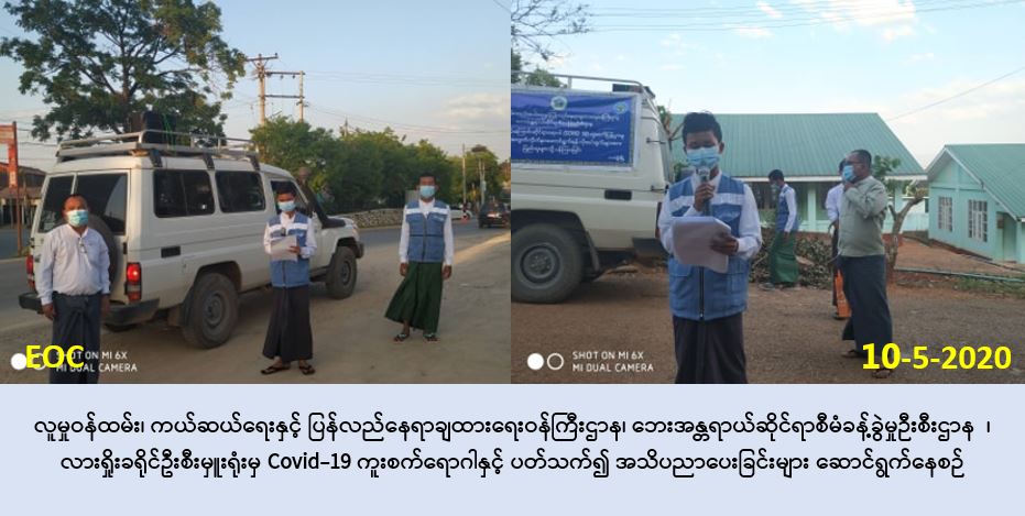 လူမှုဝန်ထမ်း၊ ကယ်ဆယ်ရေးနှင့် ပြန်လည်နေရာချထားရေးဝန်ကြီးဌာန၊ ဘေးအန္တရာယ်ဆိုင်ရာ စီမံခန့်ခွဲမှုဦးစီးဌာန၊ လားရှိုးခရိုင်ဦးစီးမှူးရုံးမှ တာဝန်ရှိသူများသည်(၁၀-၅-၂၀၂၀) ရက်နေ့တွင် ပြန်လည်ထူထောင်ရေး ဦးစီးဌာန၊ မူးယစ်ဆေးဖြတ်ပြီးသူများ ပြန်လည်ထူထောင်ရေးစခန်း၊ လူမှုဝန်ထမ်းဦးစီးဌာန၊ မြို့နယ်အထွေထွေအုပ်ချုပ်ရေးဦးစီးဌာနတို့နှင့် ပူးပေါင်း၍ လားရှိုး မြို့နယ် နားကွမ်းလုံကျေးရွာ၊ လွယ်တောက်ကျေးရွာ၊ ပန်ဟုန်းကျေးရွာနှင့် လားရှိုးပညာရေးကော လိပ်၌ တစ်ညအိပ်တည်းခိုနေထိုင်ရသော နေရပ်ပြန်ပြည်သူများအား COVID-19 ရောဂါ ကူးစက် ပျံ့နှံ့မှု မဖြစ်ပွားစေရန် သိရှိလိုက်နာ ဆောင်ရွက်ရမည့်အချက်များကို အသိပေး ပန်ကြားခြင်းများ ဆောင်ရွက်ခဲ့ကြောင်း သတင်းရရှိပါသည်။