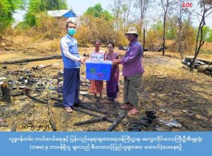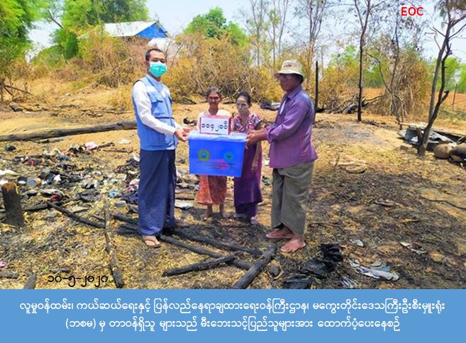 လူမှုဝန်ထမ်း၊ ကယ်ဆယ်ရေးနှင့် ပြန်လည်နေရာချထားရေးဝန်ကြီးဌာန၊ ဘေးအန္တရာယ်ဆိုင်ရာစီမံခန့်ခွဲမှု ဦးစီးဌာန၊ မကွေးတိုင်းဒေသကြီးဦးစီးမှူးရုံးမှ တာဝန်ရှိသူများသည် မကွေးမြို့နယ်၊ ပေပင်စမ်းကျေးရွာအုပ်စု၊ တည်ပင်ကန်ကျေးရွာတွင် (၉-၅-၂၀၂၀) ရက်နေ့တွင် မီးဘေးဖြစ်ပွားမှုကြောင့် ဘေးသင့်အိမ်ခြေ(၁)လုံး၊ အိမ်ထောင်စု(၁)စု၊ လူဦးရေ(၂) ဦးတို့အတွက် အိမ်ဆောက်ပစ္စည်းဖိုး (၁၀၀,၀၀၀)ကျပ်၊ လူဦးရေ(၂) ဦးအတွက် ဆန်ရိက္ခာဖိုးငွေ (၄,၂၀၀) ကျပ်၊ စုစုပေါင်း(၁၀၄,၂၀၀)ကျပ်နှင့် ကယ်ဆယ်ရေးပစ္စည်း (၁၆)မျိုး အိမ်ထောင်စု (၁) စုစာတို့အား (၁၀-၅-၂၀၂၀) ရက်နေ့ (၁၁:၀၀)နာရီအချိန်တွင် အထွေထွေအုပ်ချုပ်ရေးဦးစီးဌာနမှ တာဝန်ရှိသူ များနှင့်အတူ ဘေးသင့်ပြည်သူများလက်ဝယ်အရောက် ထောက်ပံ့ပေးအပ်ခဲ့ကြောင်း သိရှိရပါသည်။