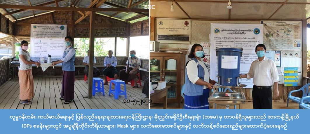 လူမှုဝန်ထမ်း၊ကယ်ဆယ်ရေးနှင့်ပြန်လည်နေရာချထားရေးဝန်ကြီးဌာန၊ဘေးအန္တရာယ်ဆိုင်ရာစီမံခန့်ခွဲမှုဦးစီးဌာန၊မိုးညှင်းခရိုင်ဦးစီးမှူးရုံးမှတာဝန်ရှိသူများသည် (၁၀-၅-၂၀၂၀)ရက်နေ့တွင် ဖားကန့်မြို့နယ်ရှိ နမ္မဖြစ် COC ဘုရား ကျောင်း၊ နမ္မဖြစ်ကက်တလစ်ဘုရားကျောင်း၊ နမ္မဖြစ်နှစ်ခြင်းဘုရားကျောင်း၊ ဆိပ်မူယူမာနှစ်ခြင်းဘုရားကျောင်း၊ ဆိပ်မူရဝမ်နှစ်ခြင်းဘုရားကျောင်း၊ ဆိပ်မူလီဆူးနှစ်ခြင်းဘုရားကျောင်း၊ ဆိပ်မူဆိုင်းတောင်နှစ်ခြင်းဘုရားကျောင်း နှင့် ဆိပ်မူရပ်ကွက်(၄)နှစ်ခြင်းဘုရားကျောင်း၊ IDPs စခန်း(၈)ခုမှ အိမ်ထောင်စု(၂၄၇)စု၊ လူဦးရေ(၁၂၁၈) ဦးအတွက် လက်ဆေးစင်(၉)စုံ၊ အဝတ်Mask(၂၄၃၆)ခု၊ အပူချိန်တိုင်းကိရိယာ(၈)ခု၊ လက်သန့်စင်ဆေးရည်(၄၉၄)ဗူး၊ Hand Speaker(၈)ခု၊ Memory Stick(၈)ခုနှင့် အသိပညာပေးဗွီနိုင်းပိုစတာ(၈)ချပ်တို့အား သွားရောက်ထောက်ပံ့ပေး ခဲ့ကြောင်း သိရှိရပါသည်။
