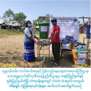 ယနေ့တွင် ကချင်ပြည်နယ်၊ မြစ်ကြီးနားမြို့ရှိ ဒူကထောင် နယ်မြေ (၄)၊ (၅)၊ (၁၄)၊ တပ်ကုန်းဂါလိလဲ၊ တပ်ကုန်းဧမာနွေလ IDP စခန်းနှင့် မိုးညှင်းမြို့ရှိ နမ္မဖြစ် COC ဘုရားကျောင်း၊ နမ္မဖြစ်ကက်သလစ်၊ နမ္မဖြစ်နှစ်ခြင်းကျောင်း၊ ဆိပ်မူယူမာ နှစ်ခြင်းကျောင်း၊ ဆိပ်မူရဝမ်နှစ်ခြင်းကျောင်း၊ ဆိပ်မူလီဆူနှစ်ခြင်းကျောင်း၊ ဆိပ်မူ ဆိုင်းတောင်နှစ်ခြင်းကျောင်း၊ ဆိပ်မူရပ်ကွက်-၄နှစ်ခြင်းကျောင်းနှင့် ပူတာအိုမြို့နယ်ရှိ လုံးစွတ်နှင့် ဒုတ္ထန် IDPစခန်း စုစုပေါင်း(၁၅)ခုသို့သွားရောက်၍ လက်သန့်ဆေးရည်(၄၉၄)ဗူး၊ ထုံးအိတ်(၅၀)အိတ်၊ ဆပ်ပြာ (၅၃၆)ခဲ၊ လက်ဆေးစင်(၁၁)ခု၊ တစ်ခါသုံး Mask (၁၅၂) ခု၊ အဝတ် Mask (၃၁၈၀)ခု၊ အပူချိန်တိုင်းကိရိယာ(၁၀)ခု၊ Hand Speaker (၁၀)ခု၊ COVID-19 အသိပညာပေးအသံဖိုင် ထည့်သွင်းထားသော Memory Stick (၁၀)ခု၊ ဗီနိုင်း(၁၀)ချပ်တို့အား ထောက်ပံ့ခဲ့ပါသည်။