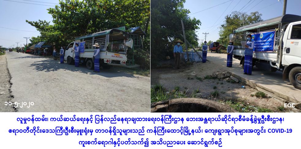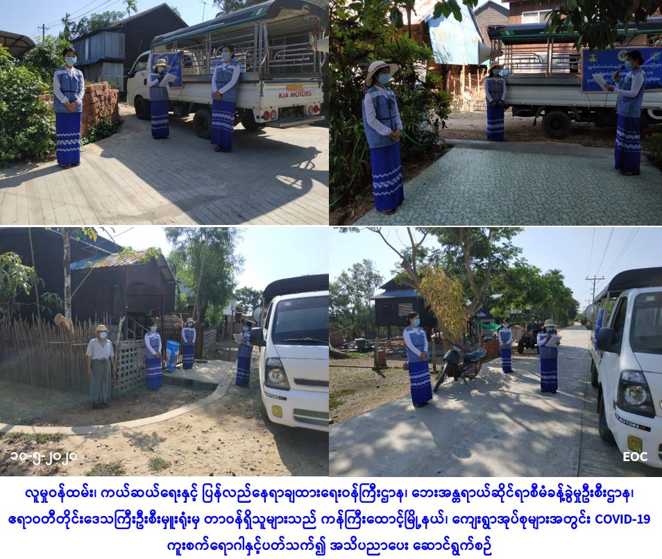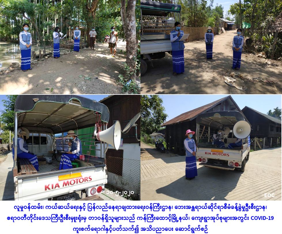 လူမှုဝန်ထမ်း၊ ကယ်ဆယ်ရေးနှင့် ပြန်လည်နေရာချထားရေးဝန်ကြီးဌာန၊ ဘေးအန္တရာယ်ဆိုင်ရာ စီမံခန့်ခွဲမှုဦးစီးဌာန၊ ဧရာဝတီတိုင်းဒေသကြီးဦးစီးမှူးရုံးမှ တာဝန်ရှိသူများသည် (၁၀-၅-၂၀၂၀) ရက်နေ့တွင် ပုသိမ်ခရိုင်၊ ကန်ကြီးထောင့်မြို့နယ်၊ အစုကြီးကျေးရွာအုပ်စု၊ အစုကြီးကျေးရွာ၊ ပဒဲကောကျေးရွာနှင့် ဒရယ်ချောင်းကျေးရွာတို့၌လည်းကောင်း ဝဲကြီးကျေးရွာအုပ်စု ဝဲကြီးကျေးရွာ၌ လည်းကောင်း၊ ပေပင်လေးကျေးရွာအုပ်စု ပေပင်လေးကျေးရွာ၌လည်းကောင်း၊ ပေပင်ကြီးကျေးရွာအုပ်စု ပေပင်ကြီးကျေးရွာ၌လည်းကောင်း၊ ရေတွင်းကုန်းကျေးရွာအုပ်စု ရေတွင်းကုန်းကျေးရွာ၌လည်းကောင်း COVID-19 ကူးစက်ရောဂါနှင့်ပတ်သက်၍ သက်ဆိုင်ရာတာဝန်ရှိသူများနှင့်အတူ ကျေးရွာနေပြည်သူများအား အသိပညာပေးဟောပြောခြင်းများဆောင်ရွက်ခဲ့ကြောင်း သတင်းရရှိပါသည်။