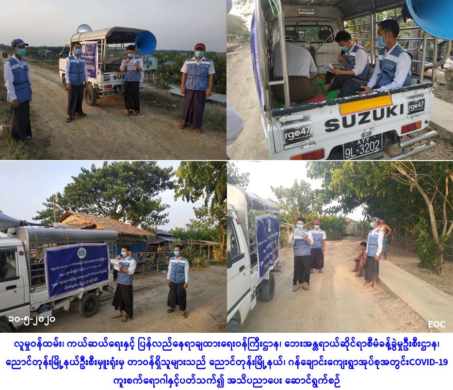 လူမှုဝန်ထမ်း၊ ကယ်ဆယ်ရေးနှင့် ပြန်လည်နေရာချထားရေးဝန်ကြီးဌာန၊ ဘေးအန္တရာယ်ဆိုင်ရာ စီမံခန့်ခွဲမှုဦးစီးဌာန၊ ညောင်တုန်းမြို့နယ်ဦးစီးမှူးရုံးမှ တာဝန်ရှိသူများသည် (၁၀-၅-၂၀၂၀) ရက်နေ့တွင် ညောင်တုန်းမြို့နယ်၊ ဂန်ချောင်းကျေးရွာအုပ်စုအတွင်းရှိ ကျေးရွာ (၅) ရွာ၌ Covid-19 ကာကွယ်၊ တားဆီး၊ ထိန်းချုပ်၊ ကုသရေးဆိုင်ရာ ပြည်သူအသိပညာပေး အသံဖိုင်အား ဖွင့်လှစ်၍ အသိပညာပေးခြင်း၊ လှည့်လည်ဟောပြောခြင်းများ ဆောင်ရွက်ခဲ့ကြောင်း သတင်းရရှိပါသည်။