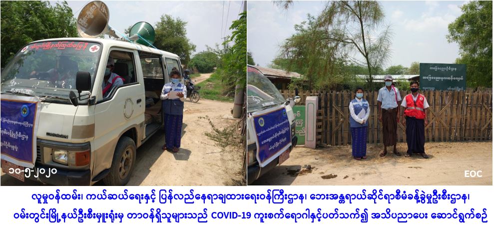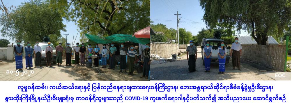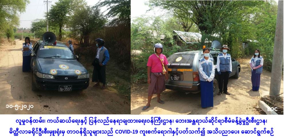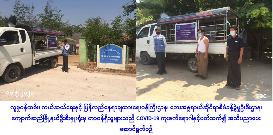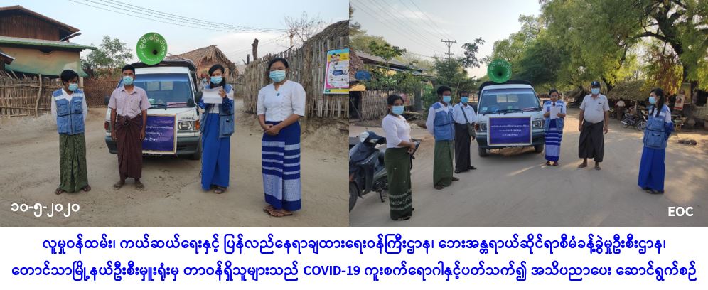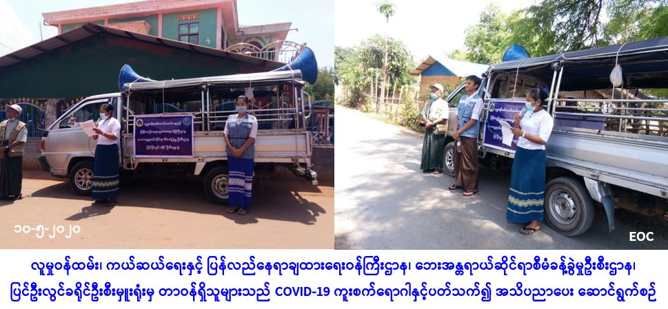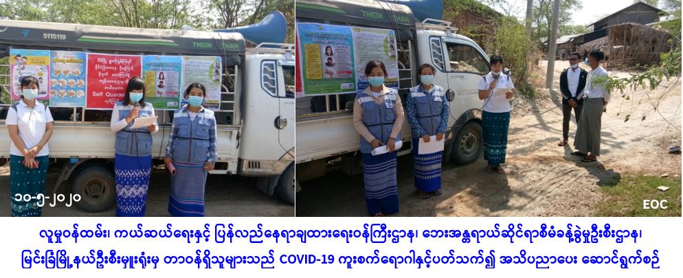 လူမှုဝန်ထမ်း၊ ကယ်ဆယ်ရေးနှင့် ပြန်လည်နေရာချထားရေးဝန်ကြီးဌာန၊ ဘေးအန္တရာယ်ဆိုင်ရာ စီမံခန့်ခွဲမှုဦးစီးဌာန၊ ပြင်ဦးလွင်ခရိုင်ဦးစီးမှူးရုံး၊ မိတ္ထီလာခရိုင်ဦးစီးမှူးရုံး၊ ကျောက်ဆည်မြို့နယ်ဦးစီးမှူးရုံး၊ ၀မ်းတွင်းမြို့နယ်ဦးစီးမှူးရုံး၊ တောင်သာမြို့နယ်ဦးစီးမှူးရုံး၊ မြင်းခြံမြို့နယ်ဦးစီးမှူးရုံးနှင့် နွားထိုးကြီးမြို့နယ်ဦးစီးမှူးရုံးတို့မှ တာ၀န်ရှိသူများသည် ပြင်ဦးလွင်မြို့နယ်၊ သာစည်မြို့နယ်၊ ကျောက်ဆည်မြို့နယ်၊ ၀မ်းတွင်းမြို့နယ်၊ တောင်သာမြို့နယ်၊ မြင်းခြံမြို့နယ်နှင့် နွားထိုးကြီးမြို့နယ်များရှိ ရပ်ကွက်၊ ကျေးရွာအုပ်စုများအတွင်း (၁၀-၅-၂၀၂၀) ရက်နေ့တွင် COVID-19 ကူးစက်ရောဂါနှင့် ပတ်သက်သည့် ဆောင်ရန်/ရှောင်ရန်များကို အသံချဲ့စက်များဖြင့် အသိပညာပေး လုပ်ငန်းများအား ဆောင်ရွက်ခဲ့ကြောင်း သတင်းရရှိပါသည်။