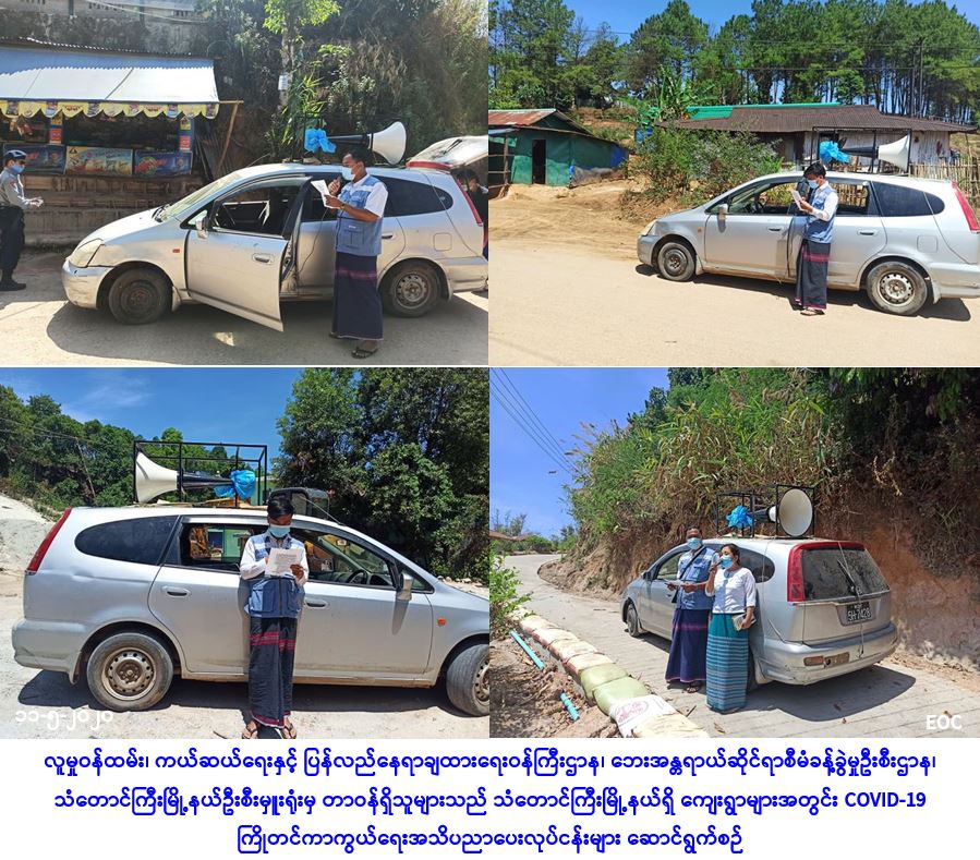 လူမှုဝန်ထမ်း၊ ကယ်ဆယ်ရေးနှင့် ပြန်လည်နေရာချထားရေးဝန်ကြီးဌာန၊ ဘေးအန္တရာယ်ဆိုင်ရာစီမံခန့်ခွဲမှုဦးစီးဌာန၊ သံတောင်ကြီးမြို့နယ်ဦးစီးမှူးရုံးမှ တာဝန်ရှိသူများသည် (၁၁-၅-၂၀၂၀) ရက်နေ့၊ (၀၈:၀၀) နာရီအချိန်မှ (၁၂:၀၀) နာရီအချိန်ထိ သံတောင်ကြီးမြို့နယ်အတွင်းရှိ စီပင်ကလေးကျေးရွာ၊ ဘာမိုးကျေးရွာ၊ ဆူးပုပ်မြောင်ကျေးရွာ၊ စိန်ကုန်းကျေးရွာ၊ သရဲယူးကျေးရွာနှင့် မဲကတုံးကျေးရွာများ၌ COVID-19 ကြိုတင်ကာကွယ်ရေးအသိပညာပေးလုပ်ငန်းများအား ပြန်ကြားရေးနှင့် ပြည်သူ့ဆက်ဆံရေးဦးစီးဌာနနှင့်ပူးပေါင်း၍ အသိပညာပေးဆောင်ရွက်ခဲ့ကြောင်း သတင်းရရှိပါသည်။