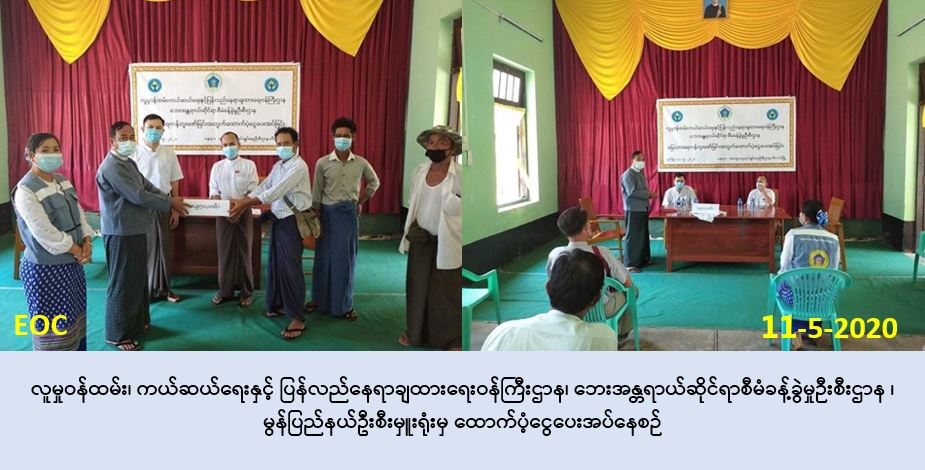လူမှုဝန်ထမ်း၊ ကယ်ဆယ်ရေးနှင့် ပြန်လည်နေရာချထားရေးဝန်ကြီးဌာန၊ ဘေးအန္တရာယ်ဆိုင်ရာ စီမံခန့်ခွဲမှုဦးစီးဌာန၊ မွန်ပြည်နယ်ဦးစီးမှူးရုံးမှ တာဝန်ရှိသူများသည် (၁၁-၅-၂၀၂၀) ရက်နေ့တွင် သထုံခရိုင်ဦးစီးမှူးရုံးမှ တာဝန်ရှိသူများနှင့် ပူးပေါင်း၍ (၁၃:၀၀)နာရီအချိန်မှ(၁၄:၀၀) နာရီအချိန် ထိ မွန်ပြည်နယ်၊ သထုံခရိုင်၊ ဘီးလင်းမြို့နယ် ဝင်းကံကျေးရွာအုပ်စု၊ ကြာစီအောင်ကျေးရွာနှင့် ကိုးတဲစုကျေးရွာတို့တွင် အိမ်ထောင်စု (၂၀၀) စုနှင့် လူဦးရေ (၆၀၀) ဦးခန့်တို့အတွက် သောက်သုံး ရေ လုံလောက်စွာရရှိရေး လိုအပ်လျက်ရှိသည့် မြေသားရေကန် တူးဖော်ခြင်းအတွက် ထောက်ပံ့ ငွေ(၈၉၇၀၀၀၀/-)ကျပ် အား ဘီးလင်းမြို့နယ်၊ အထွေထွေအုပ်ချုပ်ရေးဦးစီးဌာန အစည်းဝေး ခန်းမ၌ ပြည်နယ်လွှတ်တော်ကိုယ်စားလှယ် ဒေါက်တာခင်နိုင်ဦး၊ ဘီးလင်းမြို့နယ် မဲဆန္ဒနယ် မြေအမှတ် (၁) ထံသို့ ပေးအပ်ခဲ့ပြီးဖြစ်ပါကြောင်း သတင်းရရှိပါသည်။