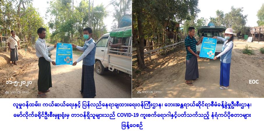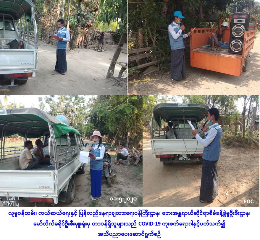 လူမှုဝန်ထမ်း၊ ကယ်ဆယ်ရေးနှင့် ပြန်လည်နေရာချထားရေးဝန်ကြီးဌာန၊ ဘေးအန္တရာယ်ဆိုင်ရာ စီမံခန့်ခွဲမှုဦးစီးဌာန၊ မော်လိုက်ခရိုင်ဦးစီးမှူးရုံးမှ တာဝန်ရှိသူများသည် ရပ်မိ၊ ရပ်ဖများနှင့်ပူးပေါင်းပြီး (၁၁-၅-၂၀၂၀) ရက်နေ့တွင် အင်ကုန်းကျေးရွာ၊ အင်းပေါက်ကျေးရွာ၊ ရွေလင်းတကျေးရွာ၊ လက်ပန်ကျေးရွာ၊ ဝဲကသာကျေးရွာစသည့်ကျေးရွာများအတွင်း COVID-19 ရောဂါကူးစက်ပျံ့နှံ့မှုများ မရှိစေရန် ဆောင်ရန်ရှောင်ရန်အချက်များအား အသိပညာပေးလှည့်လည်နှိုးဆော်ခဲ့ပြီး နံရံကပ်ပိုစတာများနှင့် အသိပညာပေးလက်ကမ်းစာစောင်များ ဖြန့်ဝေခြင်းတို့ဆောင်ရွက်ခဲ့ကြောင်း သတင်းရရှိပါသည်။