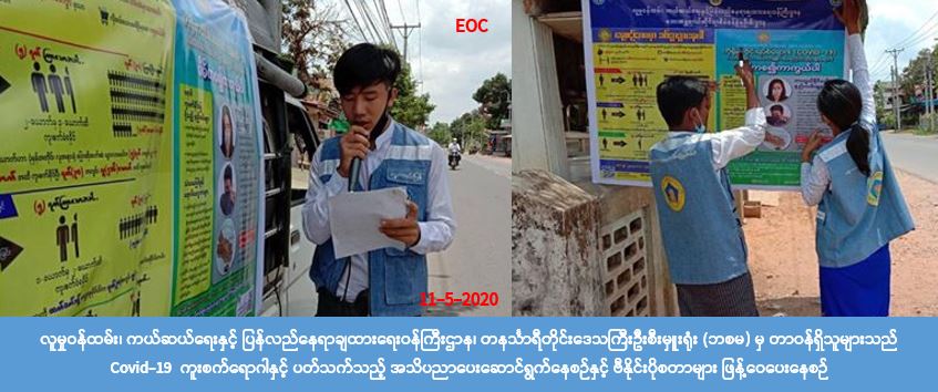 လူမှုဝန်ထမ်း၊ ကယ်ဆယ်ရေးနှင့် ပြန်လည်နေရာချထားရေးဝန်ကြီးဌာန၊ ဘေးအန္တရာယ်ဆိုင်ရာစီမံခန့်ခွဲမှု ဦးစီးဌာန၊ တနင်္သာရီတိုင်းဒေသကြီးဦးစီးမှူးရုံးမှ တာ၀န်ရှိသူများသည် (၁၁-၅-၂၀၂၀)ရက်နေ့တွင် တနင်္သာရီတိုင်းဒေသကြီး၊ ထားဝယ်ခရိုင်၊ ရေဖြူမြို့နယ်၊ ဂန့်ကော်တော ကျေးရွာအုန်းပင်ကွင်းကျေးရွာ တို့တွင် လော်စပီကာ တို့ဖြင့် (Covid-19) အသက်ရှူလမ်းကြောင်းဆိုင်ရာရောဂါ ကြိုတင်ကာကွယ် ထိန်းချုပ်နိုင်ရန် အများပြည်သူသို့ အသိပညာပေးပန်ကြားချက်များအား လှည့်လည်ကြေညာခြင်းနှင့် အသိပညာပေး ဗီနိုင်းပိုစတာများကပ်ခြင်းတို့ကို ဆောင်ရွက်ခဲ့ကြောင်း သိရှိရပါသည်။