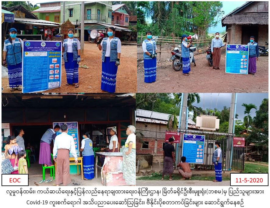 လူမှုဝန်ထမ်း၊ ကယ်ဆယ်ရေးနှင့်ပြန်လည်နေရာချထားရေးဝန်ကြီးဌာန၊ ဘေးအန္တရာယ်ဆိုင်ရာစီမံခန့်ခွဲမှုဦးစီးဌာန၊ မြိတ်ခရိုင်ဦးစီးမှူးရုံးမှ (၁၁.၅.၂၀၂၀၀နေ့ မြိတ်မြို့နယ်၊ ပသောင်းကျေးရွာ၊ ရှမ်းတောင်ကျေးရွာ၊ တက်လက်ငယ်ကျေးရွာ၊ တောင်ပုလဲကျေးရွာတို့တွင် COVID19ရောဂါ ကူးစက်ပြန့်ပွားမှုမရှိစေရေး အသိပညာပေးဆော်သြခြင်း၊ ဗီနိုင်းပိုစတာကပ်ခြင်းတို့ကို ရပ်ကျေးအဖွဲ့နှင့်ပူးပေါင်းဆောင်ရွက်ခဲ့ကြောင်း သတင်းရရှိပါသည်။