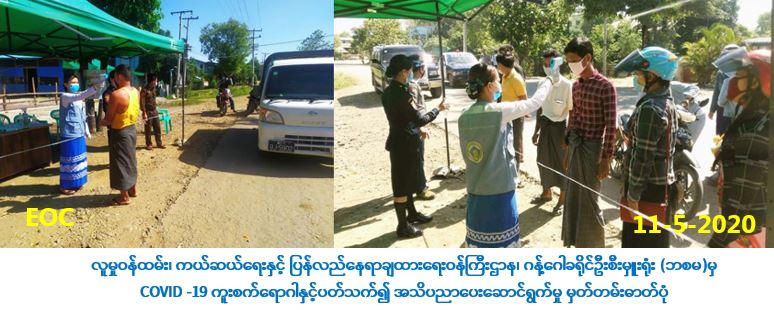 လူမှုဝန်ထမ်း၊ ကယ်ဆယ်ရေးနှင့် ပြန်လည်နေရာချထားရေးဝန်ကြီးဌာန၊ ဘေးအန္တရာယ်ဆိုင်ရာစီမံ ခန့်ခွဲမှုဦးစီးဌာန၊ ဂန့်ဂေါခရိုင်ဦးစီးမှူးရုံးမှ တာဝန်ရှိသူများသည် (၁၁-၅-၂၀၂၀)ရက်နေ့ (ဝ၈:၃၀) နာရီမှ (၁၇:၃၀) နာရီအချိန်ထိ မြို့နယ်အထွေထွေအုပ်ချုပ်ရေးဦးစီးဌာန၊ ဌာနဆိုင်ရာများမှ တာဝန်ရှိသူများဖြင့်ပူးပေါင်း၍ လတ်တလောနိုင်ငံအသီးသီးတွင် ကူးစက်ပြန့်ပွားလျက်ရှိသည့် COVID-19 ရောဂါကြိုတင်ကာကွယ်ရေးအတွက် ဂန့်ဂေါခရိုင်အတွင်း ယာဉ်ဝင်/ထွက်အတွက် စီးနင်းလိုက်ပါလာသော ခရီးသည်များအား ကိုယ်အပူချိန်တိုင်းထွာပေးခြင်းနှင့် ပြည်တွင်း/ပမှ ပြန်လာသူများအား စာရင်းပြုစုခြင်းတို့ကို ဆောင်ရွက်ခဲ့ကြောင်း သတင်းရရှိပါသည်။