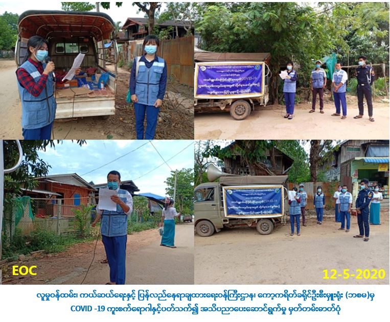 လူမှုဝန်ထမ်း၊ ကယ်ဆယ်ရေးနှင့် ပြန်လည်နေရာချထားရေးဝန်ကြီးဌာန၊ ဘေးအန္တရာယ်ဆိုင်ရာစီမံ ခန့်ခွဲမှုဦးစီးဌာန၊ ကော့ကရိတ်ခရိုင်ဦးစီးမှူးရုံးမှ တာဝန်ရှိသူများသည်(၁၂-၅-၂၀၂၀)ရက်နေ့၊ နံနက် (၀၈:၀၀)နာရီချိန်မှ နေ့လည်(၁၂:၀၀)နာရီချိန်ထိ မီးသတ်ဦးစီးဌာန၊ ပြန်ကြားရေးနှင့် ပြည်သူ့ ဆက်ဆံရေး ဦးစီးဌာနတို့နှင့်ပူးပေါင်း၍ ကော့ကရိတ်မြို့၊ လောင်းကိုင်ကျေးရွာအုပ်စုအတွင်းရှိ လောင်းကိုင်ကျေးရွာ၊ ဖားကျကျေးရွာ၊ နောင်တလားကျေးရွာ၊ မိတလန်းနိုင်ကျေးရွာနှင့် ကမော့ကတူးကျေးရွာတို့၌ COVID-19 ကူးစက်မြန်အဆုတ်ရောင်ရောဂါ ပြန့်ပွားမှုမရှိစေရေးအတွက် ဆောင်ရန်/ရှောင်ရန်တို့အား အသံချဲ့စက်ဖြင့်ကျေးရွာနေပြည်သူများသို့ အသိပညာပေး ဆောင်ရွက်ခဲ့ ကြောင်း သတင်းရရှိပါသည်။