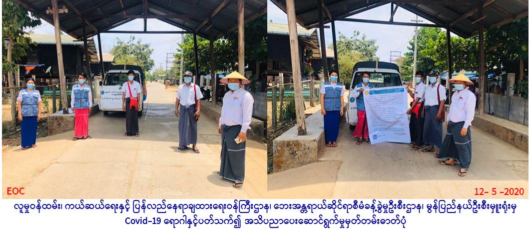 လူမှုဝန်ထမ်း၊ ကယ်ဆယ်ရေးနှင့်ပြန်လည်နေရာချထားရေး ဝန်ကြီးထားဌာန၊ ဘေးအန္တရာယ်ဆိုင်ရာစီမံခန့်ခွဲမှုဉီးစီးဌာန၊ မွန် ပြည်နယ်ဉီးစီးမှူးရုံးမှ တာဝန်ရှိသူများသည် (၁၂-၅-၂၀၂၀) ရက်နေ့ မွန်ပြည်နယ်၊ မော်လမြိုင်မြို့နယ်၊ ကော့လှာကျေးရွာနှင့် ဖဲထော်ကျေးရွာတို့တွင် COVID -19 ကူးစက်ရောဂါနှင့်ပတ်သက်၍ ကြိုတင်ကာကွယ် ထိန်းချုပ်နိုင်ရန် ပြည်သူများထံသို့ အသိပညာပေး ပန်ကြားချက်များ အား အသံချဲ့စက်များဖြင့် လှည့်လည်အသိပေး ဟောပြောခြင်း၊ ဗီနိုင်းပိုစတာပေးအပ်ခြင်းများ ဆောင်ရွက်ခဲ့ပါကြောင်း သတင်းရရှိပါသည်။