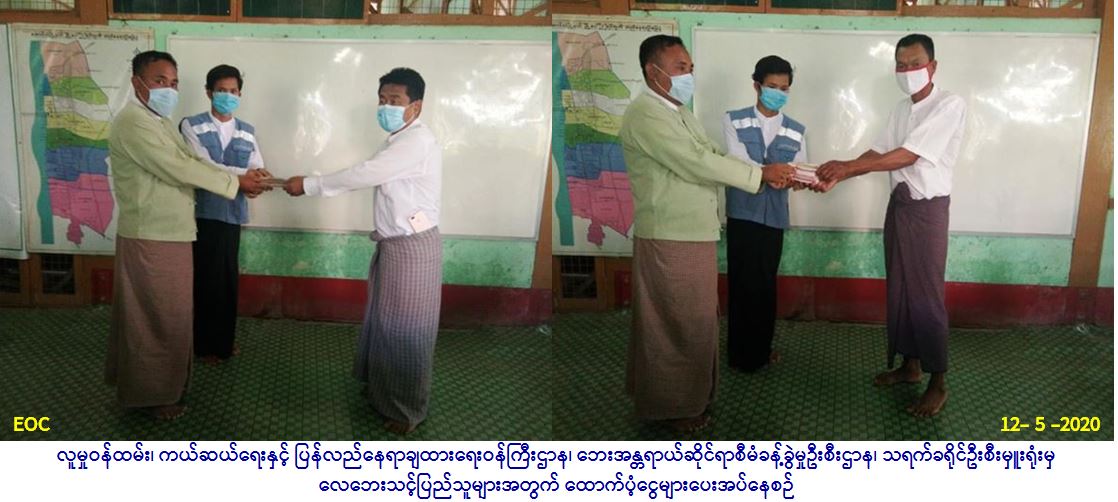 လူမှုဝန်ထမ်း၊ ကယ်ဆယ်ရေးနှင့်ပြန်လည်နေရာချထားရေး ဝန်ကြီးထားဌာန၊ ဘေးအန္တရာယ်ဆိုင်ရာစီမံခန့်ခွဲမှုဉီးစီးဌာန၊ သရက် ခရိုင်ဦးစီးမှူးရုံးမှ တာဝန်ရှိသူများသည် သရက်ခရိုင်၊ အောင်လံမြို့နယ်၌ (၁၁-၅-၂၀၂၀)ရက်နေ့၊ (၁၇:၃၀)နာရီမှ (၁၇:၄၅) အချိန်အထိ ကျေးရွာအုပ်စု(၄)စု၊ ကျေးရွာ (၄) ရွာတွင် လေပြင်းတိုက်ခတ်မှုကြောင့် လူနေအိမ်(၂၃)လုံး အမိုးလန်ပျက်စီးခဲ့ပြီး အိမ်ထောင်စု(၂၃)စု၊ လူဦးရေ (၈၁) ဦးလေဘေးသင့်ခဲ့ရာ လေဘေးသင့် အိမ်ထောင်စု (၂၃) စု၊ လူဦးရေ (၈၁) ဦးတို့အတွက် ဆန်ရိက္ခာဖိုး(၇)ရက်စာ (၁၇၀၁၀ဝ/-)၊ အိမ်ဆောက်ပစ္စည်းဖိုး (၄၄၆၀၀ဝ/-)ကျပ်၊ ရန်ပုံငွေစုစုပေါင်း (၆၁၆၁၀ဝ/-)ကျပ်တို့အား (၁၂.၅.၂၀၂၀) ရက်နေ့၊ နံနက် (၁၂:၀၀) နာရီအချိန်တွင် အောင်လံမြို့နယ်၊ အထွေထွေအုပ်ချုပ်ရေးဦးစီးဌာနမှ တာဝန်ရှိသူများ ရှေ့မှောက်တွင် သက်ဆိုင်ရာ ကျေးရွာအုပ်ချုပ်ရေးမှူးများထံသို့ ထောက်ပံ့ပေးအပ်ခဲ့ပါကြောင်း သတင်းရရှိပါသည်။