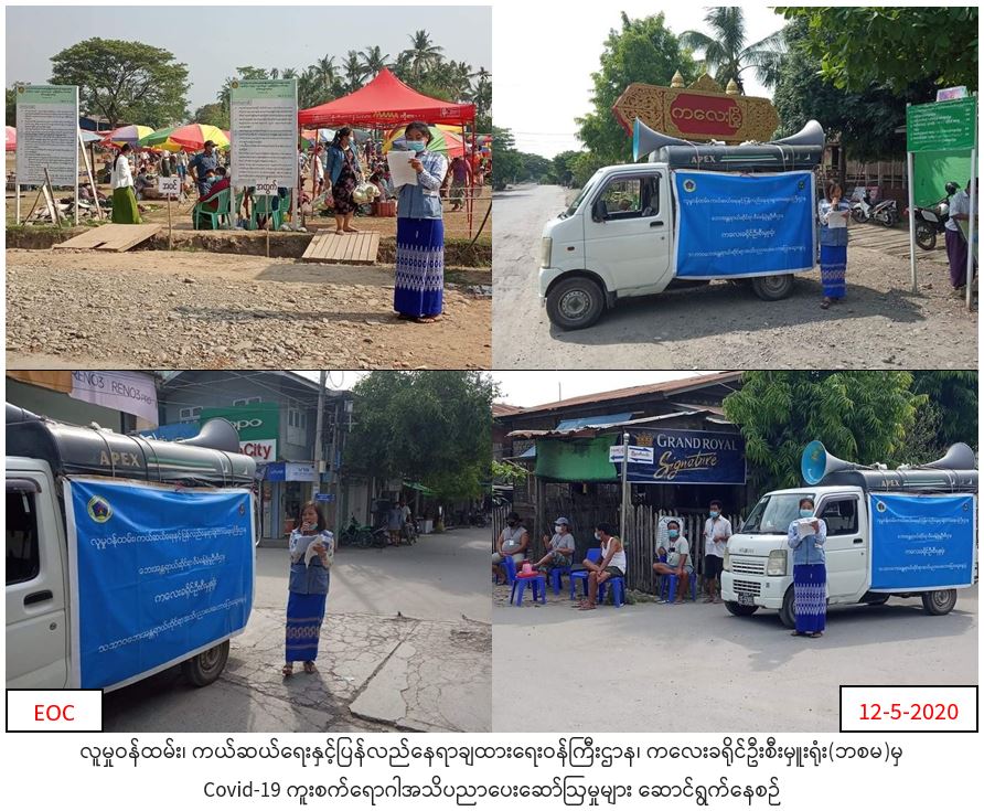 လူမှုဝန်ထမ်း၊ ကယ်ဆယ်ရေးနှင့်ပြန်လည်နေရာချထားရေးဝန်ကြီးထားဌာန၊ ဘေးအန္တရာယ်ဆိုင်ရာစီမံခန့်ခွဲမှုဉီးစီးဌာန၊ ကလေးခရိုင်ဦးစီးမှူးရုံးမှ တာဝန်ရှိသူများသည် (၁၂.၅.၂၀၂၀) ရက်နေ့တွင်၊ နံနက်(၀၈:၀၀)နာရီမှ (၁၃:၀၀)နာရီအချိန်အထိ ကလေးမြို့ပေါ်ရှိ တပ်ဦးသီတာရပ်ကွက်၊တောင်ဖီလာရပ်ကွက် ၊သဇင်ရပ်ကွက် ၊ စမ်းမြို့ရပ်ကွက်၊ တာဟန်းရပ်ကွက် ၊ကြို့သုံးပင်ရပ်ကွက်၊ လှိုင်သာယာရပ်ကွက်၊ ကလေးမြို့ စက်မှုဇုံ ၊ အင်ဒိုင်းကုန်းရပ်ကွက် ၊မြို့လှရပ်ကွက်၊ အောင်ဇေယျရပ်ကွက် နှင့်အောင်မြေမာန်ရပ်ကွက်များသို့သွားရောက်၍ COVID – 19 နှင့်ပတ်သက်၍ ဆောင်ရန်/ရှောင်ရန်များအား လိုက်နာဆောင်ရွက်သွားကြရန် လှည့်လည်၍ အသိပညာပေး ပြောကြားခဲ့ကြောင်း သတင်းရရှိပါသည်။