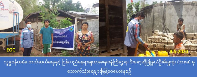 လူမှုဝန်ထမ်း၊ ကယ်ဆယ်ရေးနှင့် ပြန်လည်နေရာချထားရေးဝန်ကြီးဌာန၊ ဘေးအန္တရာယ်ဆိုင်ရာ စီမံခန့်ခွဲမှုဦးစီးဌာန၊ ဒီးမော့ဆိုမြို့နယ်ဦးစီးမှူးရုံးမှ တာဝန်ရှိသူများသည် (၉-၅-၂၀၂၀) ရက်နေ့ တွင် ဒီးမော့ဆိုမြို့နယ်၊ ဒေါတမကြီးကျေးရွာအုပ်စု၊ ဒေါကော့ကျေးရွာနှင့် ဆင်တောင်ကျေးရွာ အုပ်စု၊ လီဝိုးကျေးရွာများသို့ သောက်သုံးရေဂါလံ (၃,၂၀၀) အား သွားရောက်လှူဒါန်းခဲ့ပါကြောင်း သတင်းရရှိပါသည်။
