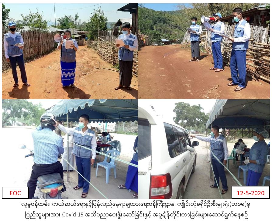 လူမှုဝန်ထမ်း၊ ကယ်ဆယ်ရေးနှင့်ပြန်လည်နေရာချထားရေးဝန်ကြီးဌာန၊ ဘေးအန္တရာယ်ဆိုင်ရာစီမံခန့်ခွဲမှုဦးစီးဌာန၊ ကျိုင်းတုံခရိုင်ဦးစီးမှူးရုံး မှ တာ၀န်ရှိသူများသည် (၁၂ – ၅ -၂၀၂၀)ရက်နေ့တွင် မြို့နယ်အထွေထွေအုပ်ချုပ်ရေးဦးစီးဌာန၊ မြို့နယ်ပြည်သူ့ကျန်းမာရေးဦးစီးဌာန၊ မြို့နယ်ကြက်ခြေနီအသင်းတို့နှင့်ပူပေါင်း၍ ကျိုင်းတုံ -တာချီလိတ်၊ နောင်နွန်းစုပေါင်းဂိတ်၌ ကျိုင်းတုံမြို့တွင်းသို့အ၀င် /အထွက် ယာဉ်လိုင်းများတွင်စီးနှင်းလိုက်ပါသော ခရီးသည်များအား ကျန်းမာရေးစစ်ဆေးခြင်း၊ မှတ်တမ်းကောက်ယူခြင်းနှင့် ကျိုင်းတုံမြို့နယ်၊ မိုင်းခွန်ကျေးရွာအုပ်စု၊ ဖာပယ်အဲကျေးရွာ၊ ပန်လီကျေးရွာနှင့် ပန်လီ(ကချင်)ကျေးရွာတို့တွင် လတ်တစ်လော နိုင်ငံအသီးသီးတွင် ကူးစက်ပြန့်ပွား လျက်ရှိသော COVID – 19 ကူးစက်ရောဂါ ကြိုတင်ကာကွယ်ထိန်းချုပ်နိုင်ရေးအတွက် COVID-19 ရောဂါ ကူးစက်ပြန့်နှံ့မှု မဖြစ်ပွားစေရန် သိရှိလိုက်နာဆောင်ရွက်ရမည့် အချက်များကိုအသိပညာပေးဟောပြောခဲ့ကြောင်း သတင်းရရှိပါသည်။