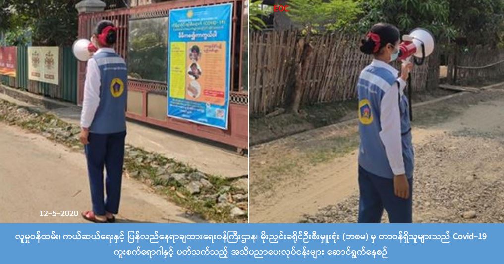 လူမှုဝန်ထမ်း၊ ကယ်ဆယ်ရေးနှင့် ပြန်လည်နေရာချထားရေးဝန်ကြီးဌာန၊ ဘေးအန္တရာယ်ဆိုင်ရာစီမံ ခန့်ခွဲမှု ဦးစီးဌာန၊ မိုးညှင်းခရိုင်ဦးစီးမှူးရုံးမှတာဝန်ရှိသူများသည် (၁၂-၅-၂၀၂၀)ရက်နေ့ (၀၉:၀၀)အချိန်၌ မိုးကောင်းမြို့နယ်၊ပွင့်ဖြူကျေးရွာ၊ကုန်းတန်းကြီးကျေးရွာ၊ လေသာကုန်းကျေးရွာနှင့် ပင်းဘောကျေးရွာ တို့တွင် COVID-19 ကူးစက်ရောဂါနှင့်ပတ်သက်၍ ဆောင်ရန်၊ ရှောင်ရန်အချက်များ၊ လိုက်နာရမည့် အချက်များအား အသိပညာပေးနှိုးဆော်ခြင်းများ ဆောင်ရွက်ခဲ့ကြောင်းသိရှိရပါသည်။