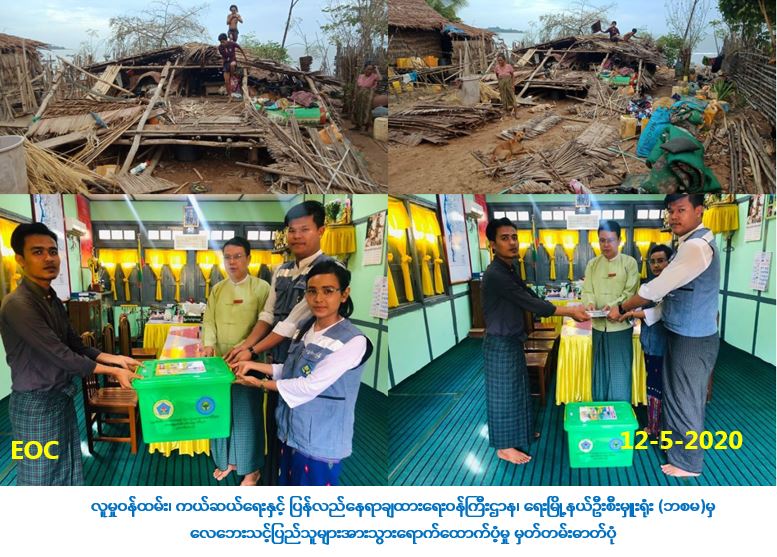 လူမှုဝန်ထမ်း၊ ကယ်ဆယ်ရေးနှင့် ပြန်လည်နေရာချထားရေးဝန်ကြီးဌာန၊ ဘေးအန္တရာယ်ဆိုင်ရာစီမံ ခန့်ခွဲမှုဦးစီးဌာန၊ မော်လမြိုင်ခရိုင်၊ ရေးမြို့နယ်ဦးစီးမှူးရုံးမှ တာဝန်ရှိသူများသည် (၁၁-၅-၂၀၂၀) ရက်နေ့ (၁၄:၃၀)အချိန်၌ ဖြစ်ပွားခဲ့သော လေပြင်းတိုက်ခတ်မှုကြောင့် ရေးမြို့နယ်၊ မကျီးကျေးရွာအုပ်စု၊ မကျီးချောင်းဝကျေးရွာတွင် ပြိုကျ/ပျက်စီးဆုံးရှုံးခဲ့သည့် အိမ်ခြေ(၁)လုံး၊ အိမ်ထောင်စု (၁)စုမှ လူဦးရေ(၅) ဦးတို့ လေဘေးသင့်ခဲ့ပါသဖြင့် လေပြင်းတိုက်ခတ်မှုကြောင့် ပျက်စီးအိမ်ခြေ(၁) လုံးအတွက် အိမ်ဆောက်ပစ္စည်းဖိုးထောက်ပံ့ငွေ(၁၀၀,၀၀၀/-) ကျပ်၊ လူဦးရေ (၅)ဦး အတွက် (၇) ရက်စာ ဆန်ရိက္ခာဖိုးထောက်ပံ့ငွေ (၁၀,၅၀၀/-)ကျပ်၊ စုစုပေါင်း ထောက်ပံ့ဖိုး ငွေ(၁၁၀,၅၀၀/-)ကျပ်နှင့် ကယ်ဆယ်ရေးပစ္စည်း(၁၇)မျိုး (၁)စုံအား မြို့နယ် အထွေထွေ အုပ်ချုပ်ရေးမှူးတို့နှင့်အတူ (၁၂-၅-၂၀၂၀) ရက်နေ့၊ နံနက်(၁၅:၀၀) နာရီချိန်တွင် ဘေးသင့် ပြည်သူများထံလက်ဝယ်အရောက် ထောက်ပံ့ပေးအပ်ခဲ့ပါကြောင်း သတင်းရရှိပါသည်။