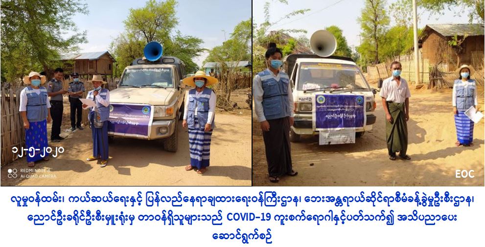 လူမှုဝန်ထမ်း၊ ကယ်ဆယ်ရေးနှင့် ပြန်လည်နေရာချထားရေးဝန်ကြီးဌာန၊ ဘေးအန္တရာယ်ဆိုင်ရာစီမံခန့်ခွဲမှုဦးစီးဌာန၊ ညောင်ဦးခရိုင်ဦးစီးမှူးရုံးမှ တာဝန်ရှိသူများသည် (၁၂-၅-၂၀၂၀) ရက်နေ့တွင် ညောင်ဦးမြို့ရှိ ကျေးရွာအုပ်စု (၅) စုမှ ရွာပေါင်း (၉) ရွာနှင့် ကျောက်ပန်းတောင်းမြို့ပေါ်ရပ်ကွက် (၃) ရပ်ကွက်နှင့် ကျေးရွာအုပ်စု (၂) စုမှ ရွာပေါင်း (၇) ရွာသို့ သွားရောက်၍ ရပ်ကွက်/ကျေးလက်နေ ပြည်သူများအား Covid-19 ကူးစက်ရောဂါနှင့်ပတ်သက်သည့် ဆောင်ရန် ရှောင်ရန်အချက်များအား အသိပညာပေးဆောင်ရွက်ခဲ့ကြောင်း သတင်းရရှိပါသည်။