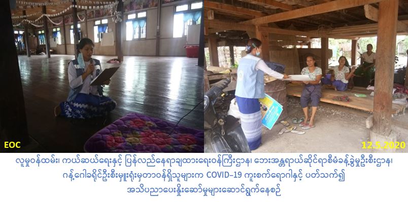 လူမှုဝန်ထမ်း၊ ကယ်ဆယ်ရေးနှင့် ပြန်လည်နေရာချထားရေးဝန်ကြီးဌာန၊ ဘေးအန္တရာယ်ဆိုင်ရာစီမံခန့်ခွဲမှုဦးစီးဌာန၊ ဂန့်ဂေါခရိုင်ဦးစီးမှူးရုံးမှတာဝန်ရှိသူများသည် (၁၂-၅-၂၀၂၀) ရက်နေ့၊ (၀၈:၀၀)နာရီအချိန်မှ၊ (၁၅:၀၀)နာရီအချိန်ထိ ဂန့်ဂေါမြို့နယ်၊ ဝါးပင်ကျေးရွာအုပ်စု၊ ဝါးပင်ကျေးရွာနှင့် ခေါင်းတင်ကျေးရွာအုပ်စု၊ ခေါင်းတင်ကျေးရွာတို့တွင် Covid-19 ရောဂါ ကူးစက်ပျံ့နှံ့မှုမဖြစ်ပွားစေရန် သိရှိလိုက်နာဆောင်ရွက်ရမည့်အချက်များကို အသိပညာပေး ဟောပြောဆောင်ရွက်ခဲ့ပါကြောင်း သတင်းရရှိပါသည်။