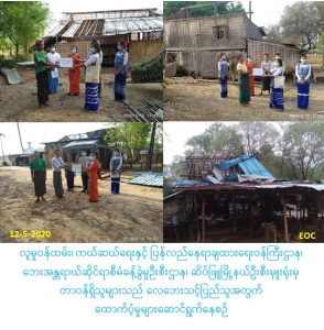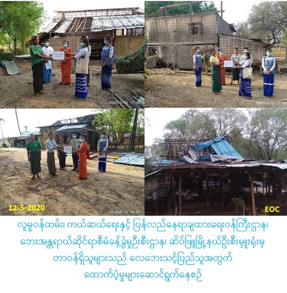 လူမှုဝန်ထမ်း၊ ကယ်ဆယ်ရေးနှင့် ပြန်လည်နေရာချထားရေးဝန်ကြီးဌာန၊ ဘေးအန္တရာယ်ဆိုင်ရာစီမံခန့်ခွဲမှုဉီးစီးဌာန၊ ဆိပ်ဖြူမြို့နယ်ဦးစီးမှူးရုံးမှ တာဝန်ရှိသူများသည် (၁၁-၅-၂၀၂၀)ရက်နေ့ (၁၆:၅၅)နာရီအချိန်မှ (၁၇:၄၅)အချိန်အထိ မိုးသက် လေပြင်းတိုက်ခက်မှုကြောင့် မကွေးတိုင်းဒေသကြီး၊ ပခုက္ကူခရိုင်၊ ဆိပ်ဖြူမြို့နယ်၊ တက်မကျေးရွာအုပ်စု၊ တက်မကျေးရွာတွင် အမိုးလန်အိမ်ခြေ(၂) လုံး၊ လူဦးရေ(၆)ဦး၊ ကျောင်းရွာကျေးရွာအုပ်စု၊ ကမ္ဘားနီကျေးရွာတွင် အမိုးလန်အိမ်ခြေ (၁) လုံး၊ လူဦးရေ (၇)ဦး၊ အနောက်ကမ်းဖြူ ကျေးရွာအုပ်စု၊ အနောက်ကမ်းဖြူ ကျေးရွာနှင့် ဘဲကျကျေးရွာတွင် အမိုးလန်အိမ်ခြေ (၁၄) လုံး၊ လူဦးရေ (၄၈)ဦး၊ သက္ကယ်ကျင်းကျေးရွာအုပ်စု၊ ထွန်ကျေးရွာတွင် အမိုးလန်အိမ်ခြေ (၁) လုံး၊ လူဦးရေ (၃)ဦး၊ ကူရှည်ကျေးရွာအုပ်စု၊ တပေါင်းကျေးရွာတွင် အမိုးလန်အိမ်ခြေ (၄၅) လုံး၊ လူဦးရေ (၂၂၉)ဦး၊ စုစုပေါင်း အမိုးလန်အိမ်ခြေ (၆၃) လုံး၊ လူဦးရေ (၂၉၃)ဦးတို့အတွက် ဆန်ရိက္ခာဖိုးထောက်ပံ့ငွေ (၆၁၅၃၀၀/-)ကျပ်၊ အိမ်ဆောက်ပစ္စည်းဖိုးထောက်ပံ့ငွေ (၂၅၂၀၀၀၀/-)ကျပ်၊ စုစုပေါင်းထောက်ပံ့ငွေ(၃၁၃၅၃၀၀/-)ကျပ်အား (၁၂-၅-၂၀၂၀)ရက်နေ့၊ (၁၆:၀၀)နာရီအချိန်တွင် ဆိပ်ဖြူမြို့နယ် တိုင်းဒေသကြီး လွှတ်တော်ကိုယ်စားလှယ်၊ မြို့နယ်အထွေထွေအုပ်ချုပ်ရေးဦးစီးဌာနမှတာဝန်ရှိသူများနှင့်အတူ လေဘေးသင့်ပြည်သူများ လက်ဝယ်အရောက် သွားရောက်ထောက်ပံ့ပေးအပ်ခဲ့ပါကြောင်း သတင်းရရှိပါသည်။