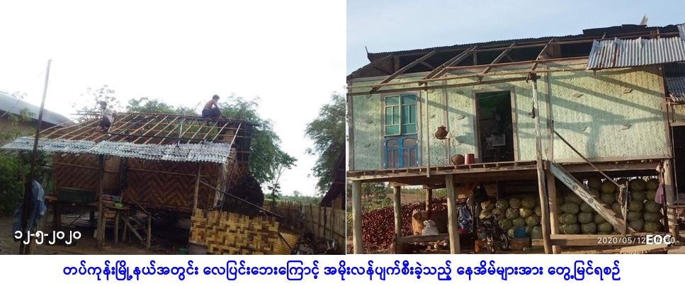 လူမှုဝန်ထမ်း၊ ကယ်ဆယ်ရေးနှင့် ပြန်လည်နေရာချထားရေးဝန်ကြီးဌာန၊ ဘေးအန္တရာယ်ဆိုင်ရာ စီမံခန့်ခွဲမှုဦးစီးဌာန၊ ဥတ္တရခရိုင်ဦးစီးမှူးရုံးမှ တာဝန်ရှိသူများသည် ပြည်ထောင်စုနယ်မြေ၊ နေပြည်တော်၊ ဥတ္တရခရိုင်၊ တပ်ကုန်းမြို့နယ်၊ ကံလှကျေးရွာအုပ်စု မဲအင်ကျေးရွာနှင့် တံခွန်တိုင်ကျေးရွာ၊ ရှားတောကျေးရွာအုပ်စု ရှားတောကျေးရွာ၊ ကင်မွန်းတန်းကျေးရွာအုပ်စု သာယာဝှမ်းကျေးရွာတို့၌ (၁၁-၅-၂၀၂၀)ရက်နေ့၊ (၁၆း၄၅) နာရီအချိန်တွင် ဖြစ်ပွားခဲ့သော လေပြင်းတိုက်ခတ်မှုကြောင့် ပျက်စီးဆုံးရှုံးခဲ့သည့် အမိုးလန်နေအိမ် (၁၉) လုံးအတွက် အိမ်ဆောက်ပစ္စည်းဖိုးထောက်ပံ့ငွေ (၇၁၆၀၀ဝိ/-)၊ ဘေးသင့်လူဦးရေ(၆၉) ဦးအတွက် ဆန်ရိက္ခာဖိုးထောက်ပံ့ငွေ (၁၄၄၉၀ဝိ/-) ကိုလည်းကောင်း၊ ကံလှကျေးရွာအုပ်စု၊ ဂါတ်ချိုင်းကျေးရွာမှ မိုးကြိုးထိမှန်သေဆုံးသူ(၁)ဦးအတွက်(၃၀၀၀၀ဝိ/-)ကိုလည်းကောင်း စုစုပေါင်းထောက်ပံ့ငွေ (၁၁၆၀၉၀ဝိ/-) တို့အား (၁၂-၅-၂၀၂၀) ရက်နေ့၊ (၁၇း၃၀) နာရီအချိန်တွင် ဘေးသင့်ပြည်သူများလက်ဝယ်သို့ သွားရောက်ထောက်ပံ့ခဲ့ကြောင်း သတင်းရရှိပါသည်။